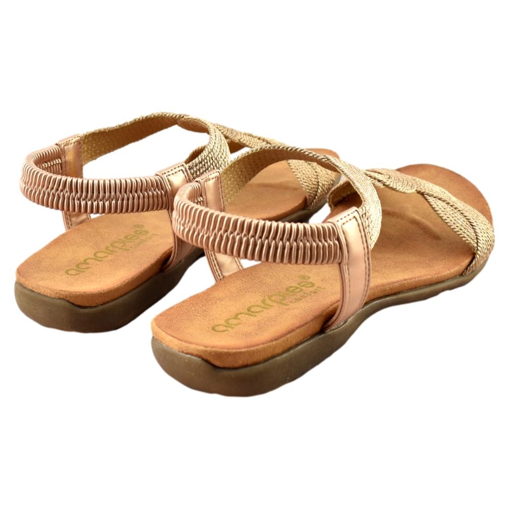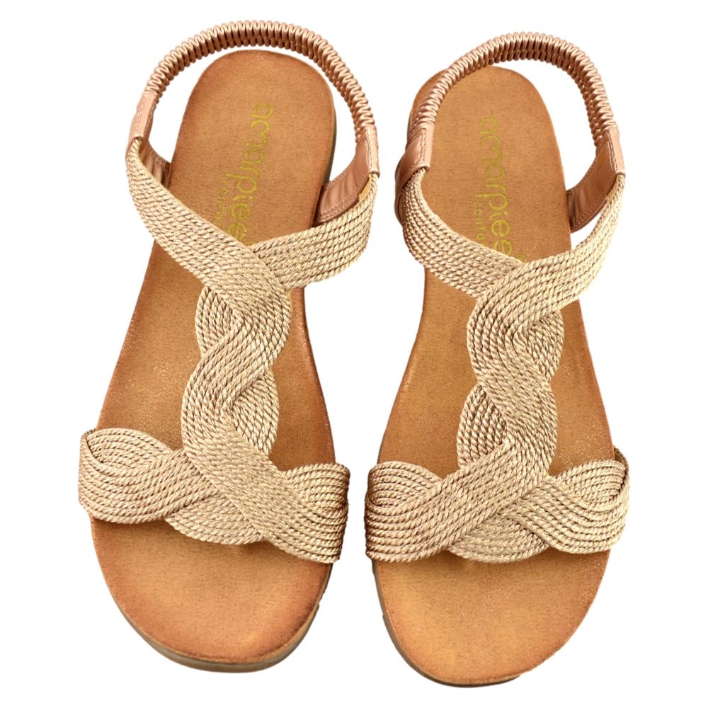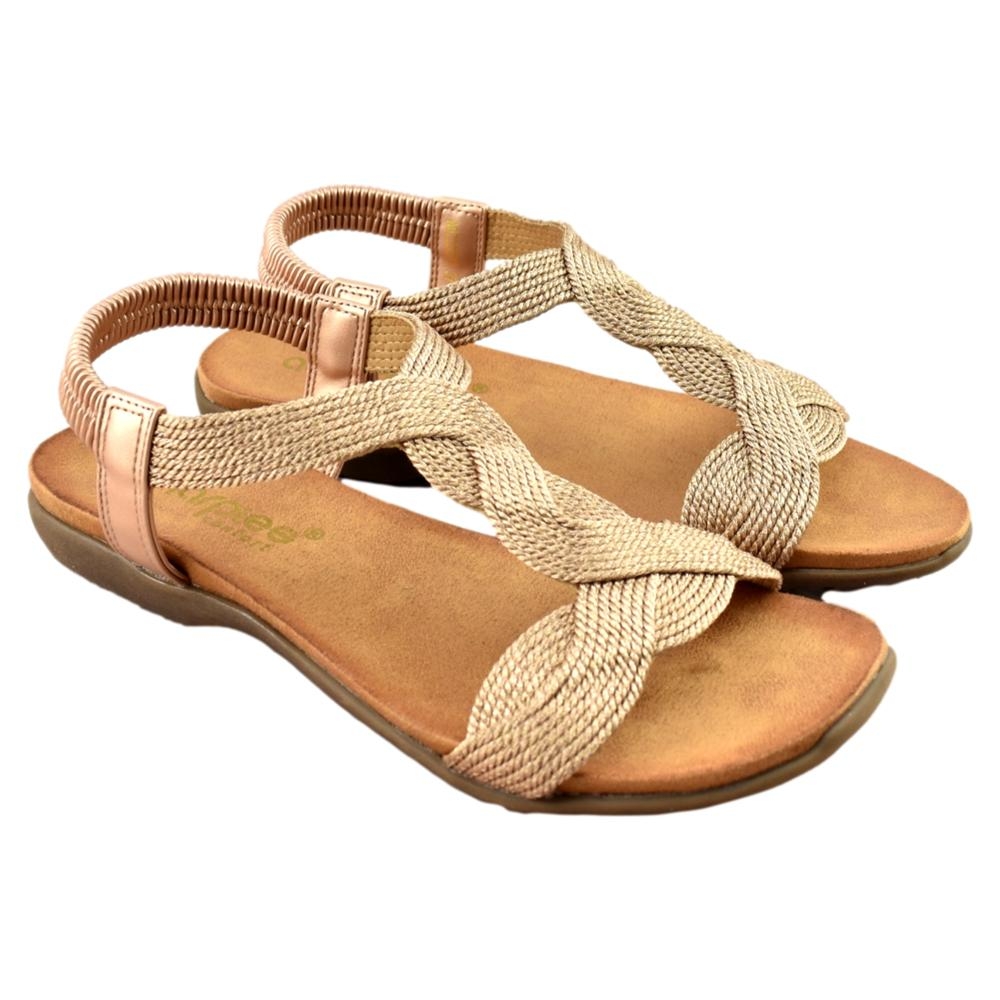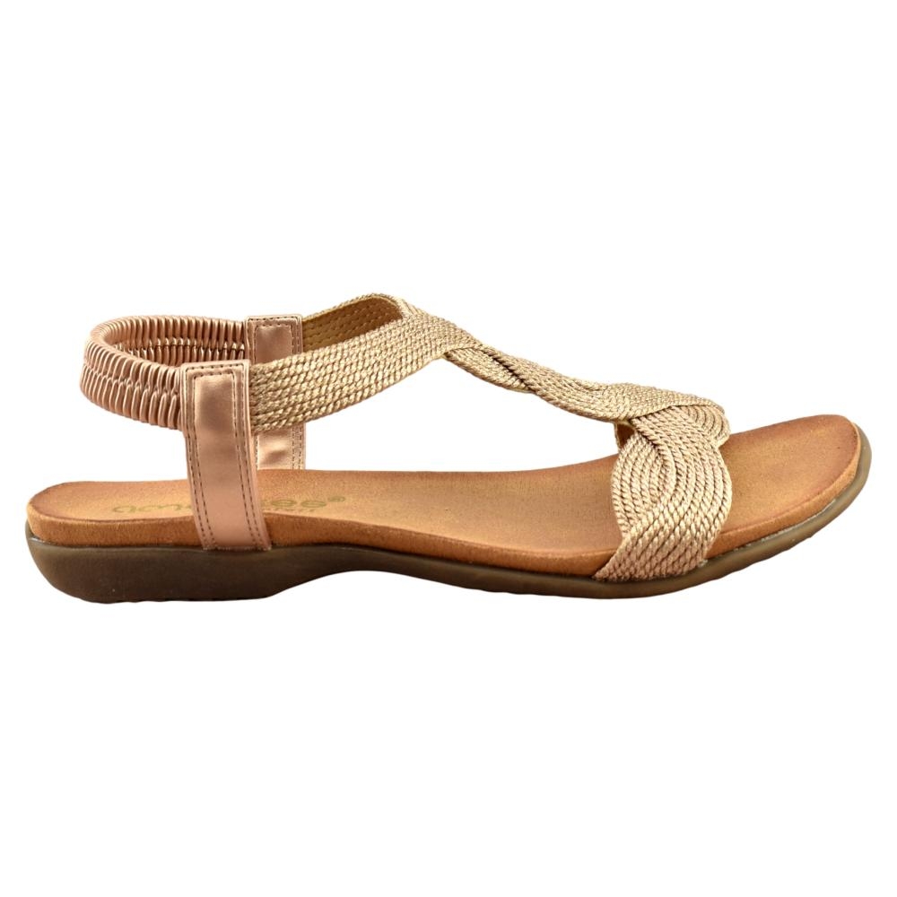 Sandalia plana con  elegante diseño en color bronce. Planta anatómica y flexible que le aporta máxima comodidad. Tira trasera con cierre elástico.