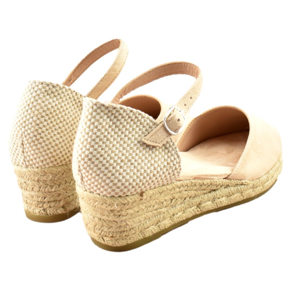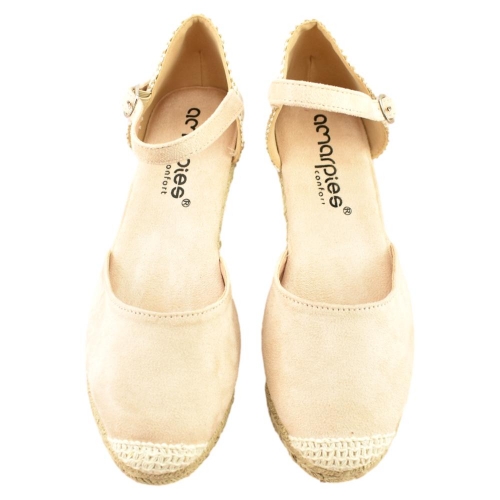 Alpargata tipo valenciana de mujer con planta acolchada de la marca Amarpies. Fabricada en material que imita la piel con efecto antelina. Pulsera al tobillo con hebilla. Cuña de 5cm de yute y suela de goma antideslizante.