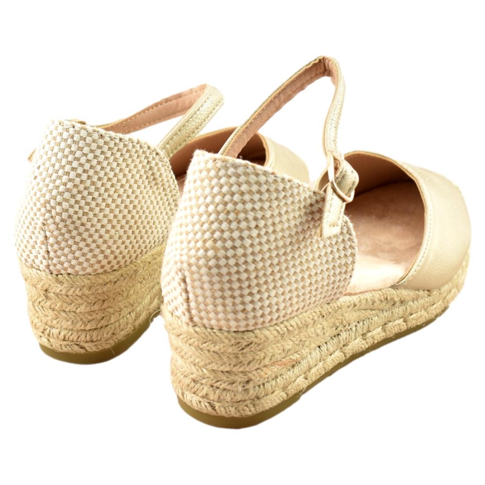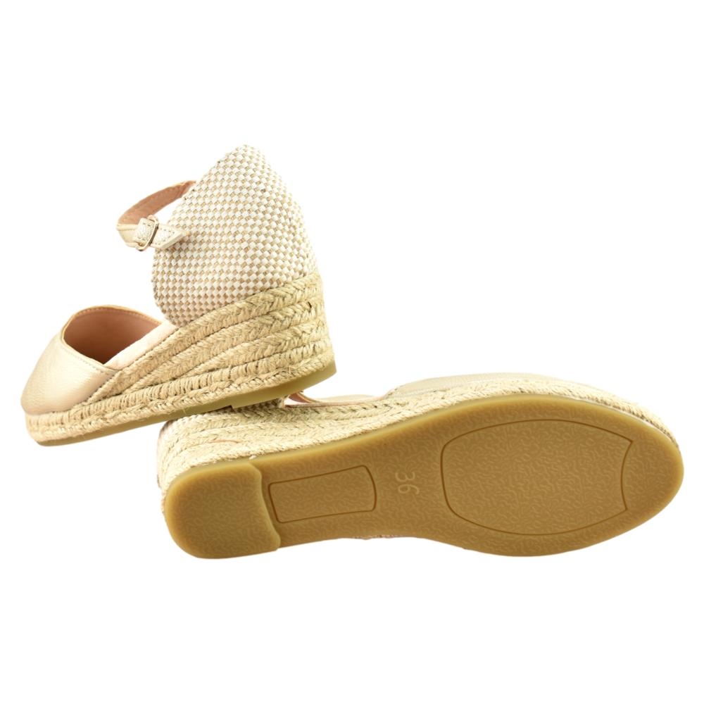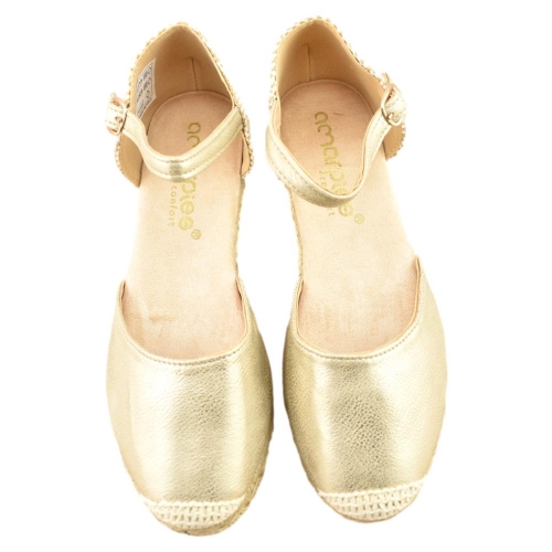 Alpargata tipo valenciana de mujer, de la marca Amarpies. Fabricada en material que imita la piel con efecto metalizado. Pulsera al tobillo con hebilla. Cuña de 5cm de yute y suela de goma antideslizante.