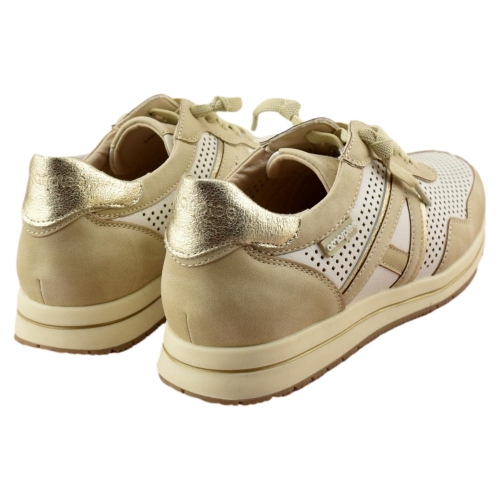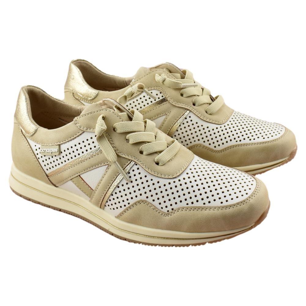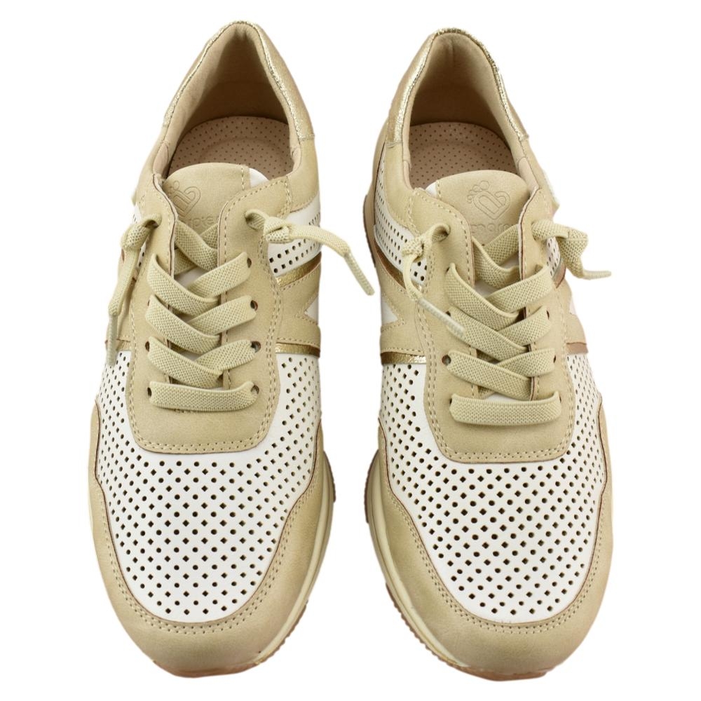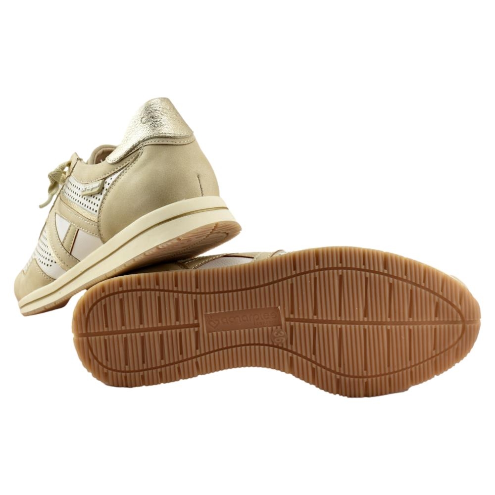 Zapato sport para mujer, realizado en combinado sintético en color blanco y arena. Cierre mediante cordón elástico para facilitar el calce. Plantilla Memory Sponge que se adapta a cualquier pie y amortigua la pisada. Modelo cómodo y actual para cualquier ocasión del día.