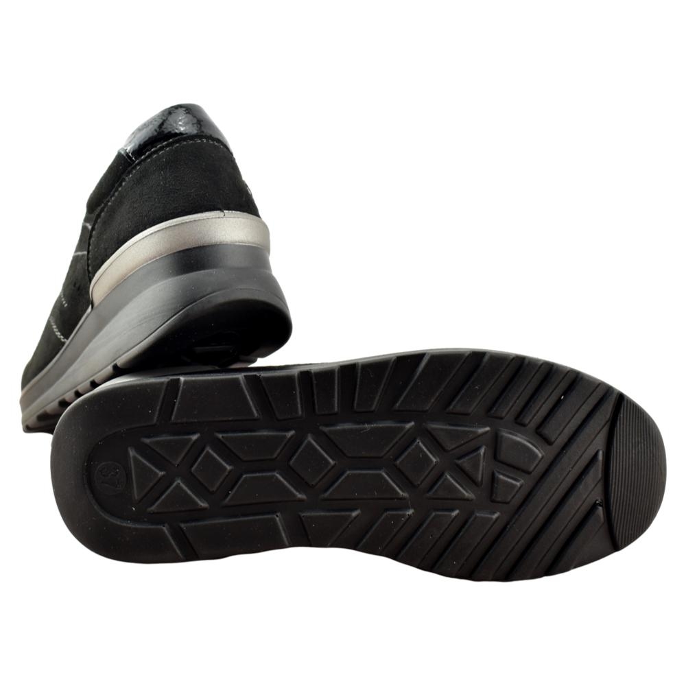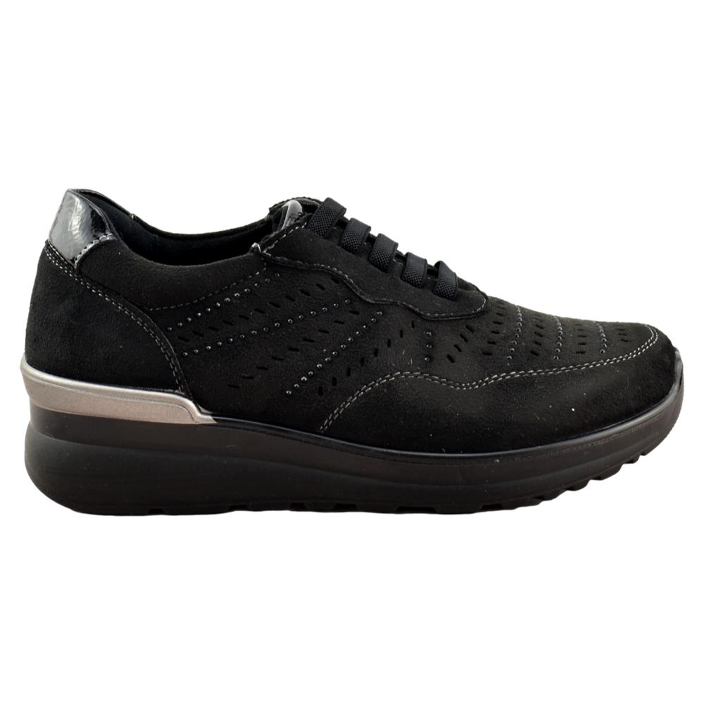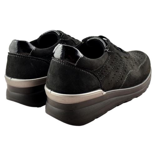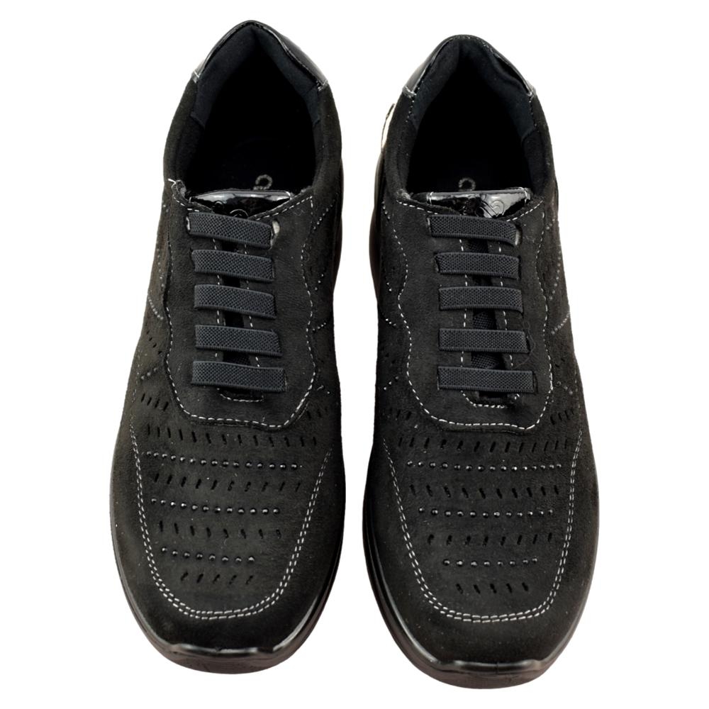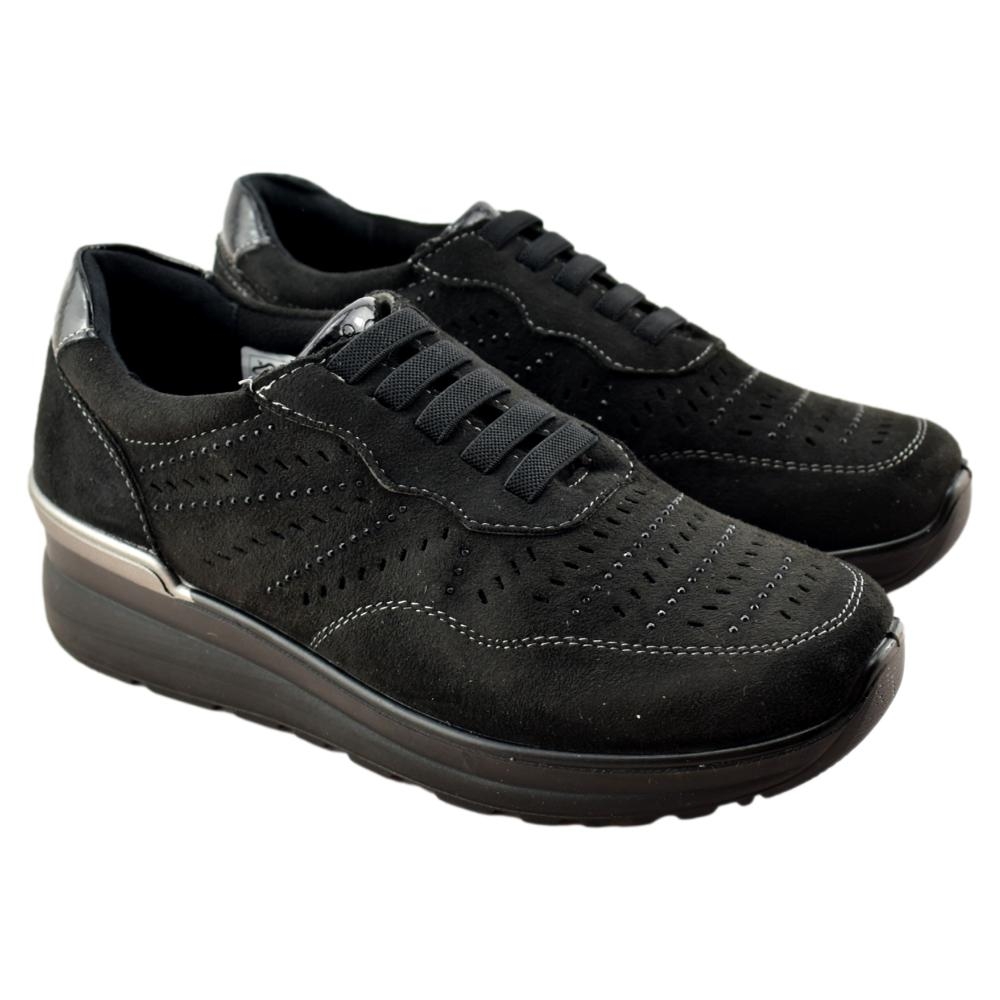 Zapato muy cómodo de color negro con plantilla acolchada extraíble. Cuña muy ligera de 4cm de altura. El forro interior es textil, suave y cálido. El exterior está fabricado también en textil con calado y pespuntes haciendo contraste. Sus tiras elásticas delanteras facilitan el calce y aseguran una sujeción perfecta.