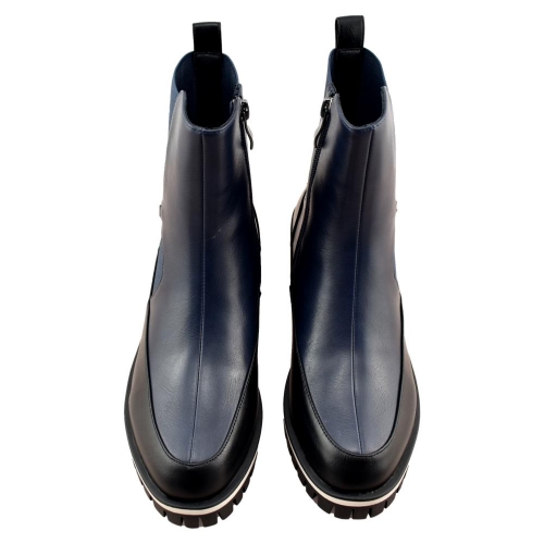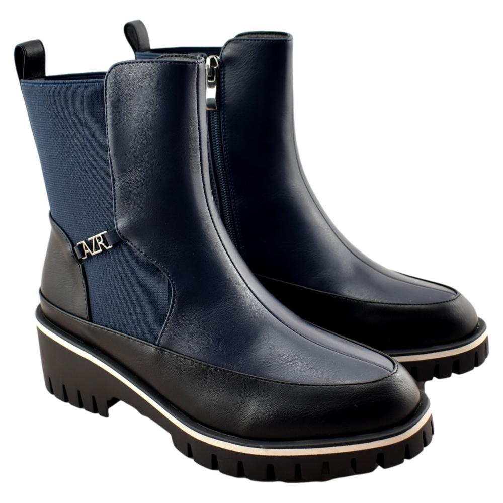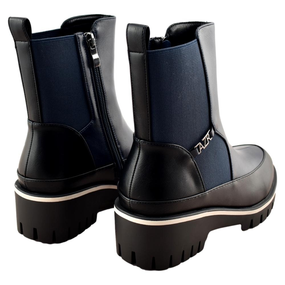 Una bota plana bicolor negra y azul con cremallera lateral muy cómodo para disfrutar la temporada de invierno. Consigue un look casual perfecto con estos botines planos para mujer.