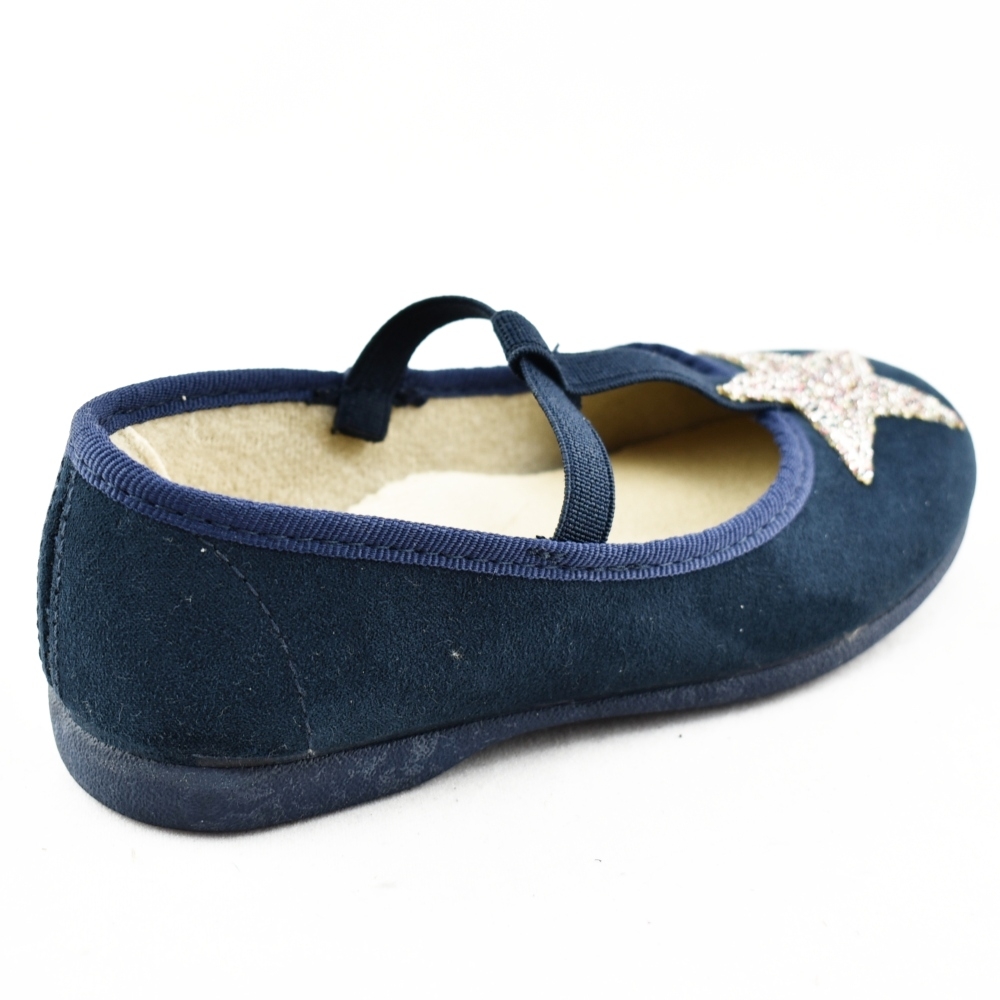 Mercedes de niña azul con adorno delantero en forma de estrella brillante de glitter. Elástico en forma de "T" que ajusta y estiliza el pie. Piso de goma muy flexible.