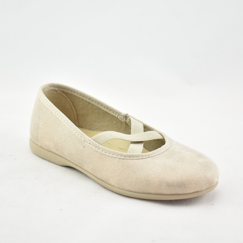 Zapato de material metalizado con elásticos cruzados delanteros.