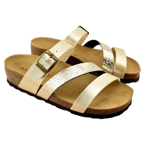 FABRICADO EN ESPAÑA. Sandalia con planta bio acolchada y cuña de 4cm. Tiras metalizadas combinadas con hebilla ajustable. Modelo muy versátil y combinable con cualquier look este verano.