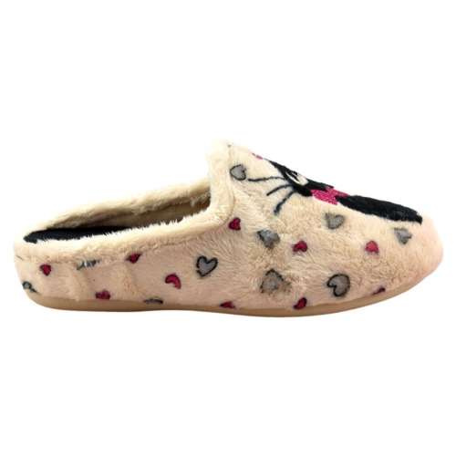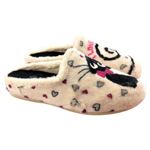 FABRICADO EN ESPAÑA. Zapatillas de casa en tejido muy suave y cálido. Fondo en color beig y divertido diseño de gato con la cola enroscada. Plantilla acolchada y extraíble que aporta comodidad en cada pisada.