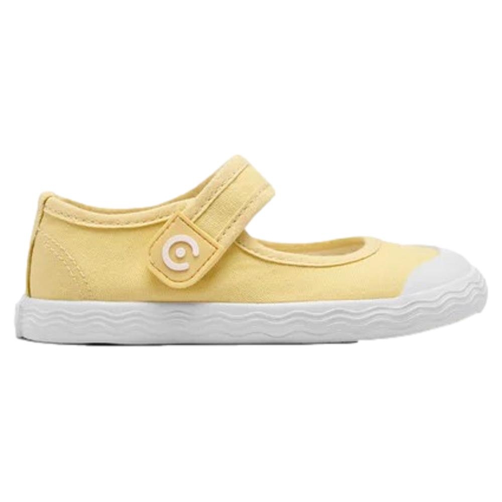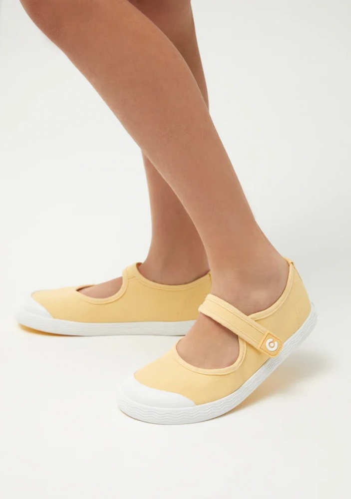 Merceditas Barefoot Goflex de lona en tono amarillo mantequilla, el color tendencia de esta primavera/verano y fácil de combinar. Con estilo deportivo y cierre de tira adherente para poner y quitar en segundos. Su diseño sencillo, con una original suela con detalle de ondas, las convierte en una opción cómoda y práctica para el cole y los fines de semana