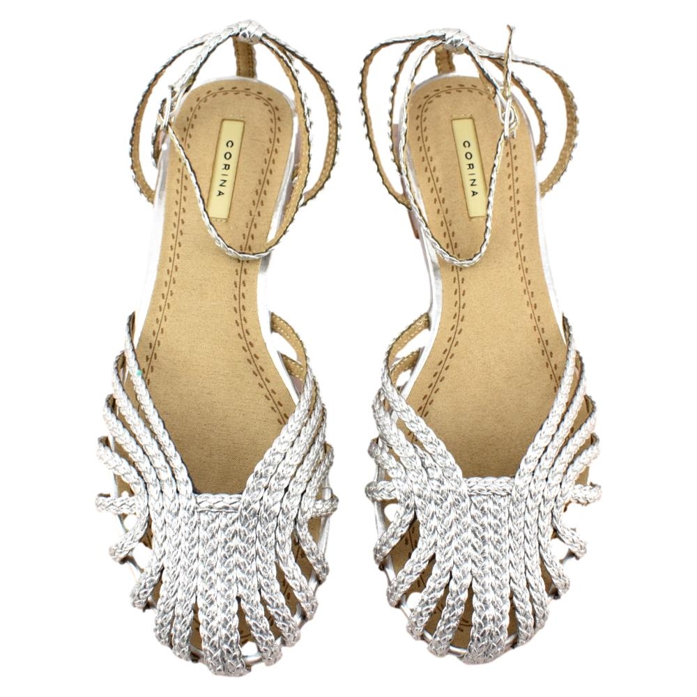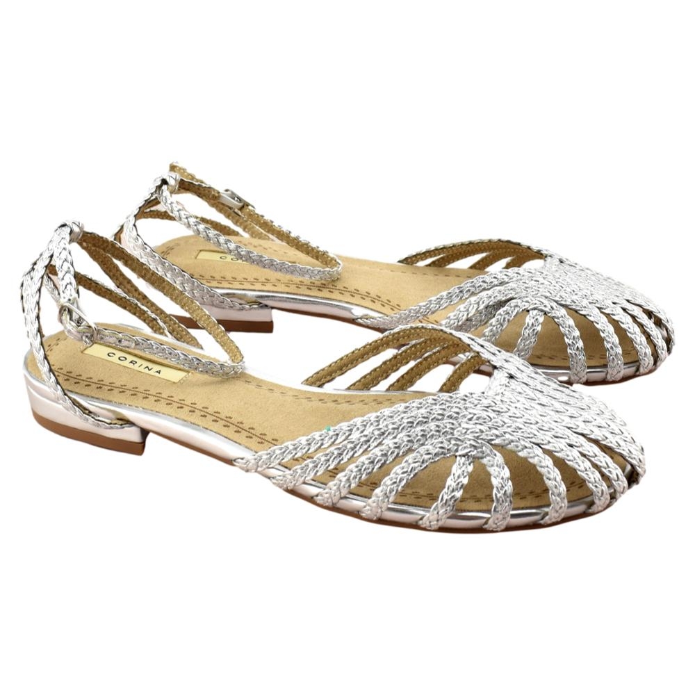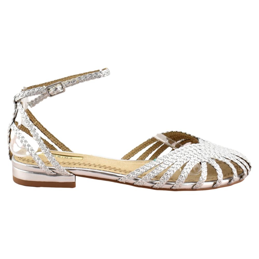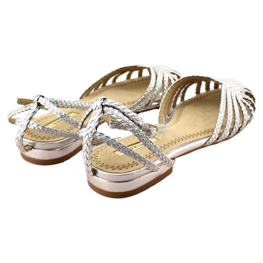 Sandalia plana de tiras en color plata con pulsera al tobillo y cierre de hebilla.