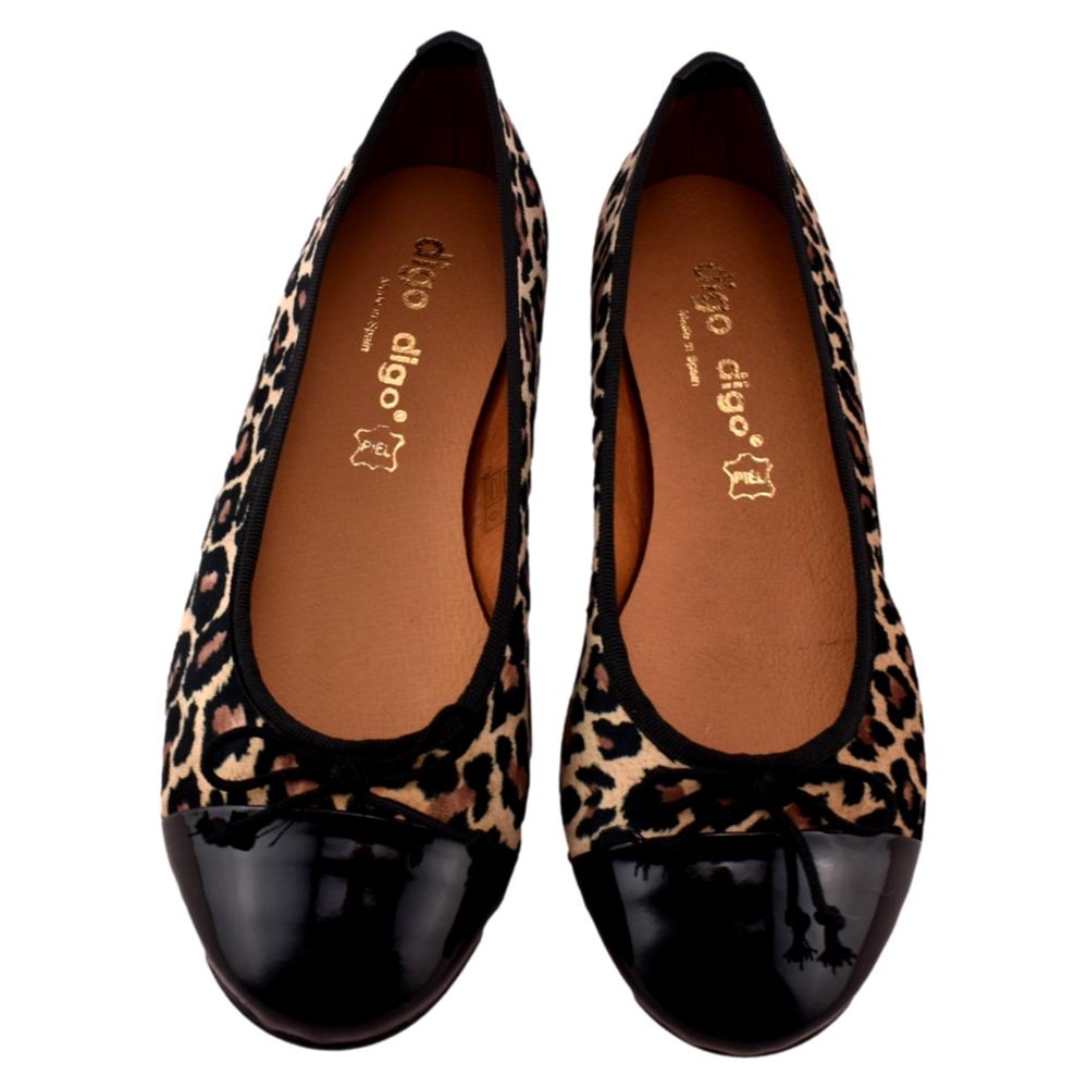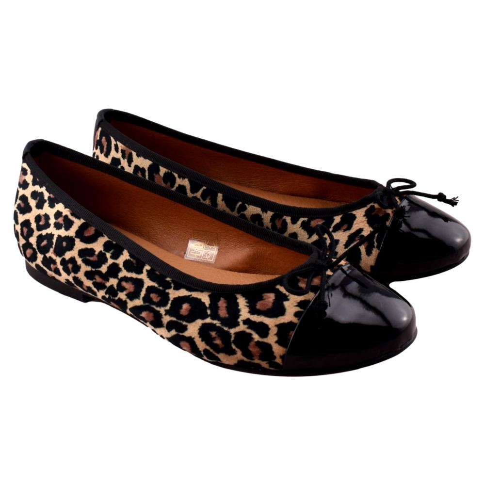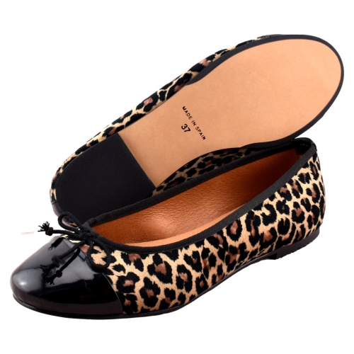 FABRICADO EN ESPAÑA. Manoletinas planas de animal print con puntera de charol.