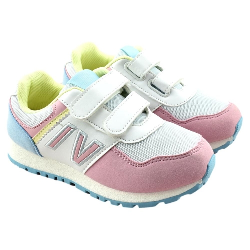 Zapatillas deportivas con doble cierre de velcro. Combina material textil con sintético. Combinada en blanco, celeste, rosa y amarillo.
