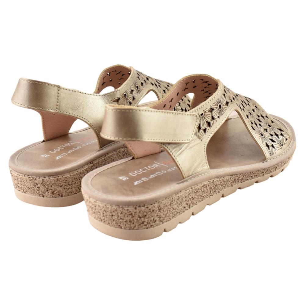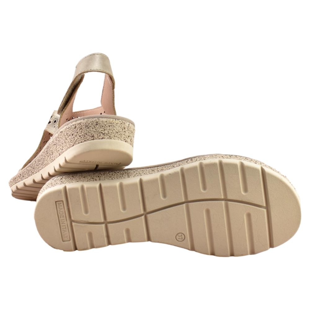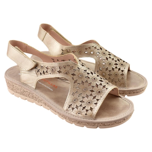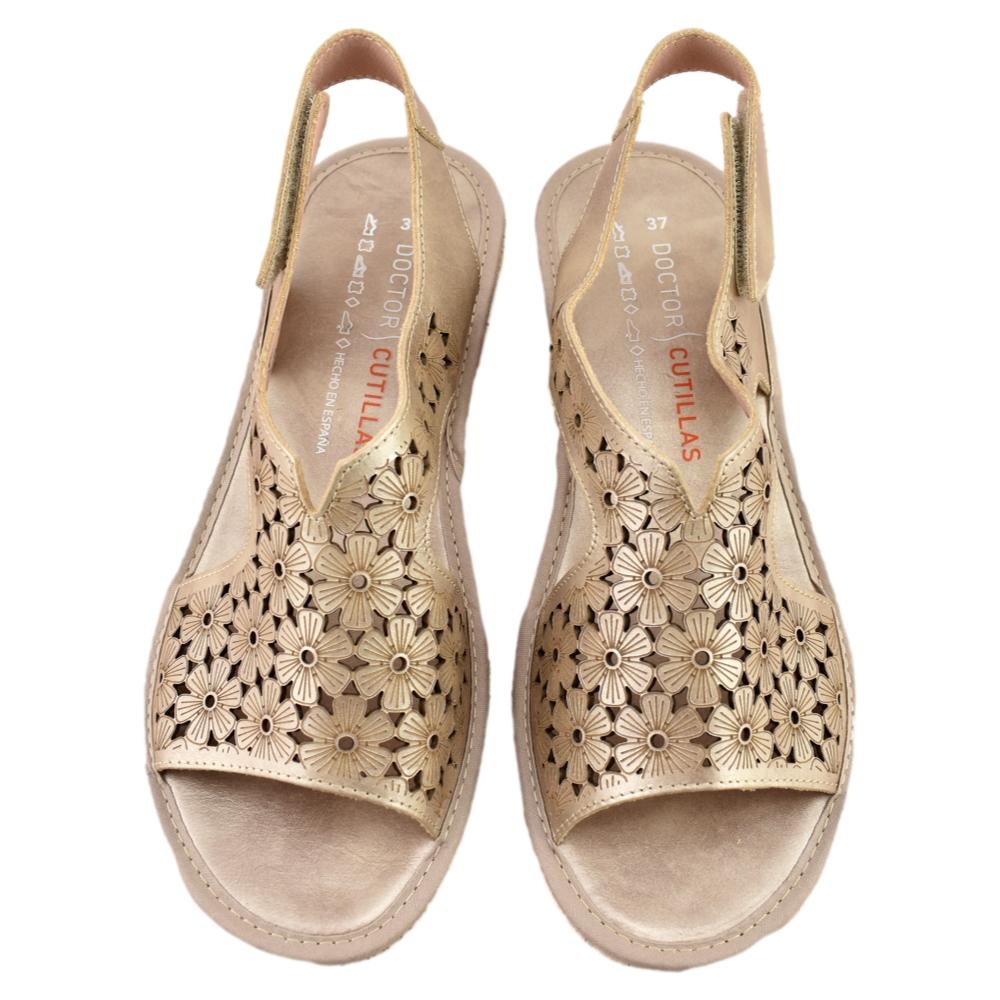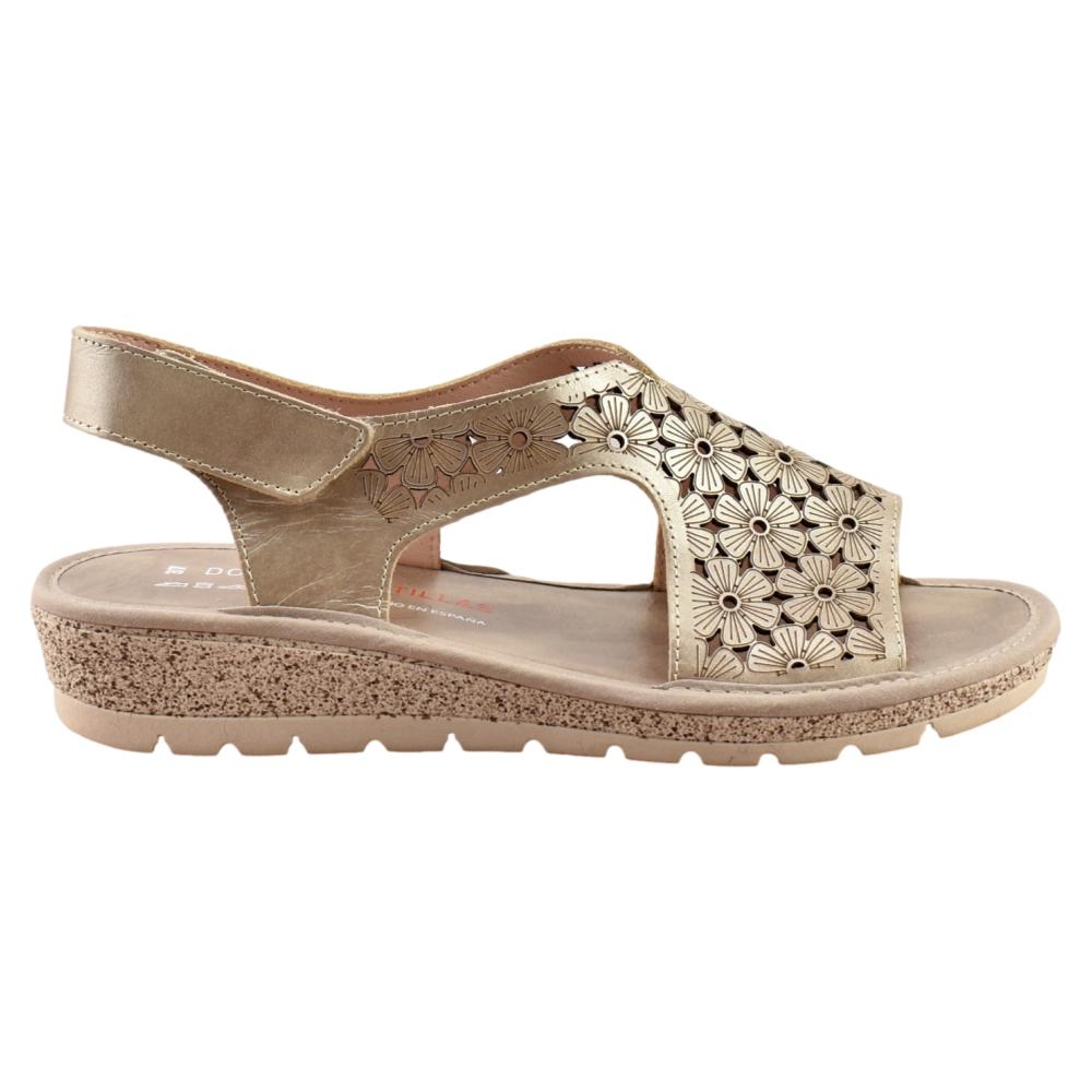 Sandalia de cuña para mujer fabricada en piel picada con estampado floral en color metalizado. Cuenta con cierre de adhesivo, plantilla de piel y suela de goma ligera y flexible.