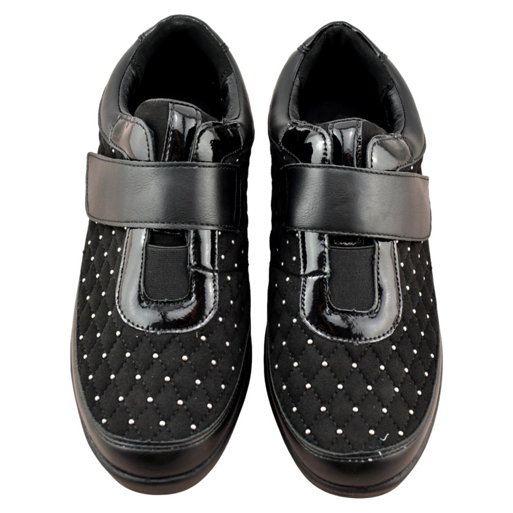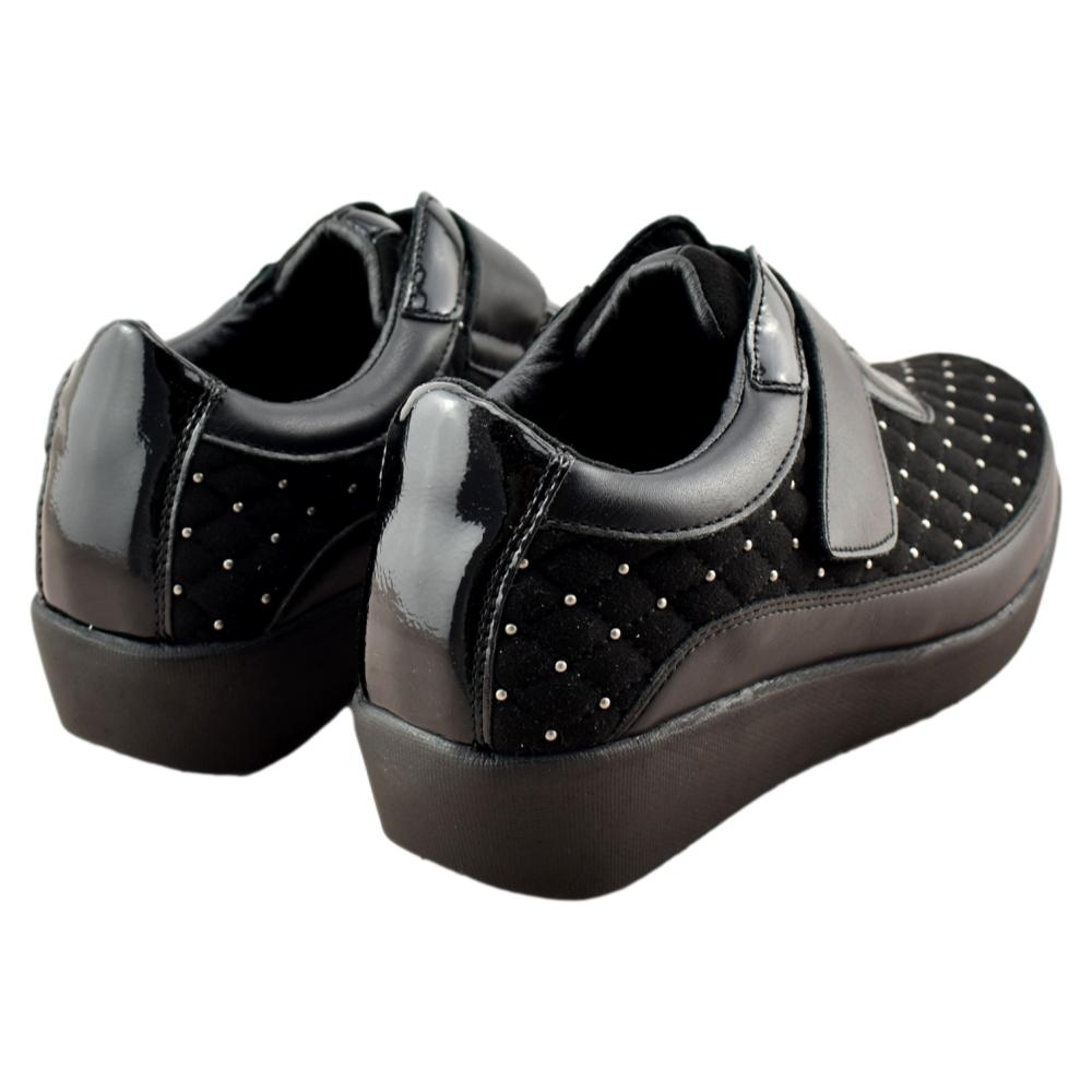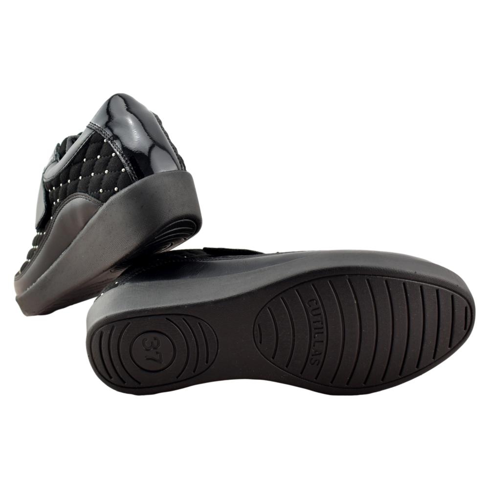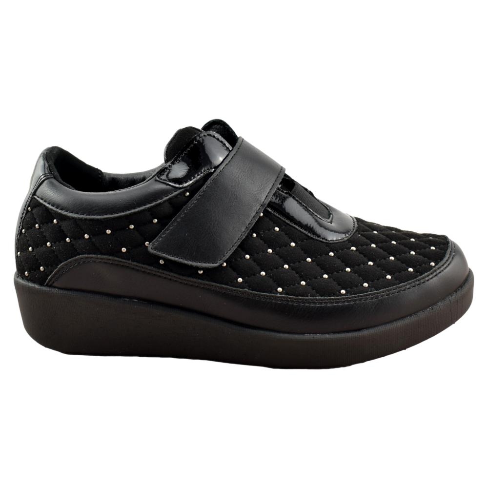 Zapato para mujer de color negro fabricado en combinación de piel sintética y textil efecto ante acolchado. Cuenta con detalle de tachuelas, cierre velcro, elástico en empeine, plantilla extraíble, forro suave confortable y suela de cuña.
