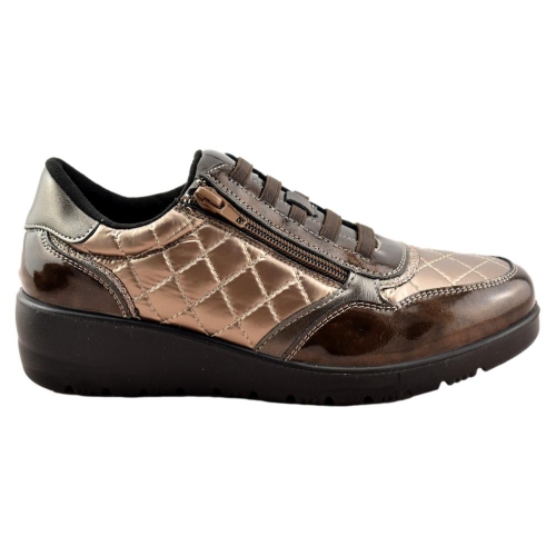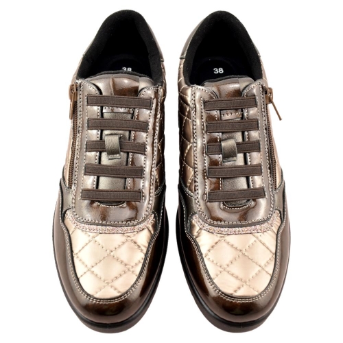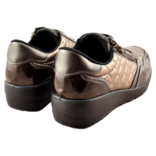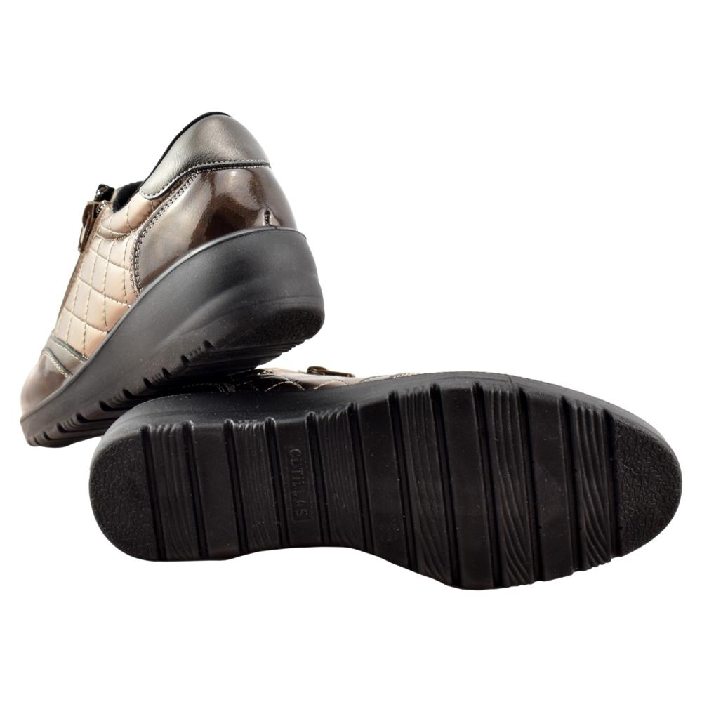 Zapato para mujer de bronce negro fabricado en combinación de piel sintética y textil efecto ante acolchado. Cuenta con detalle de tachuelas, cierre de cordón elástico, plantilla extraíble, forro suave confortable y suela de cuña.