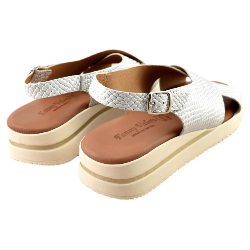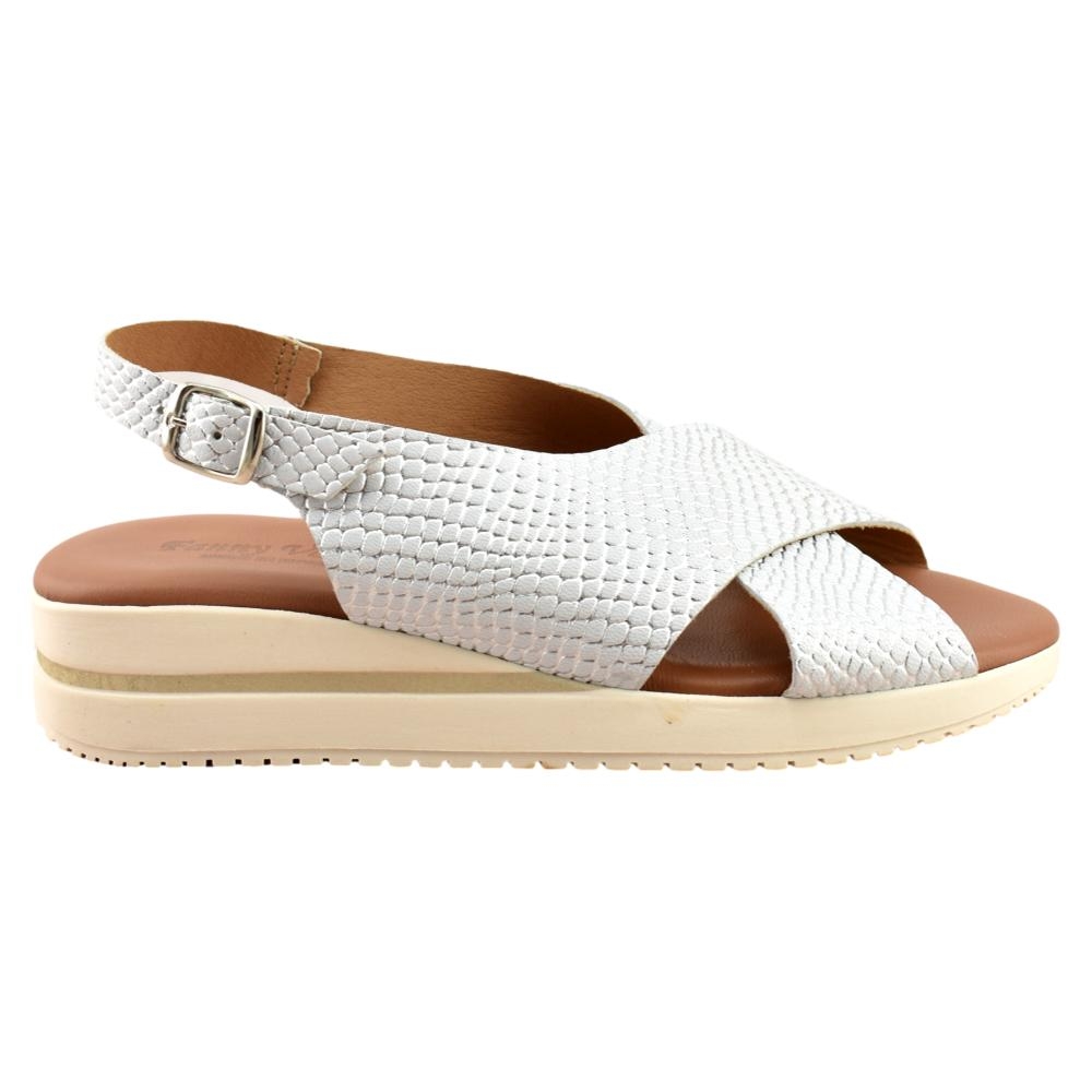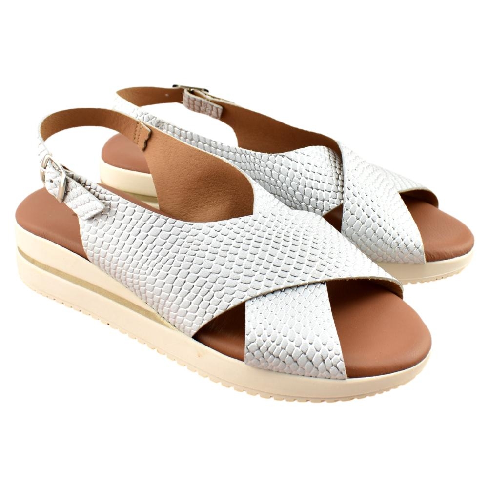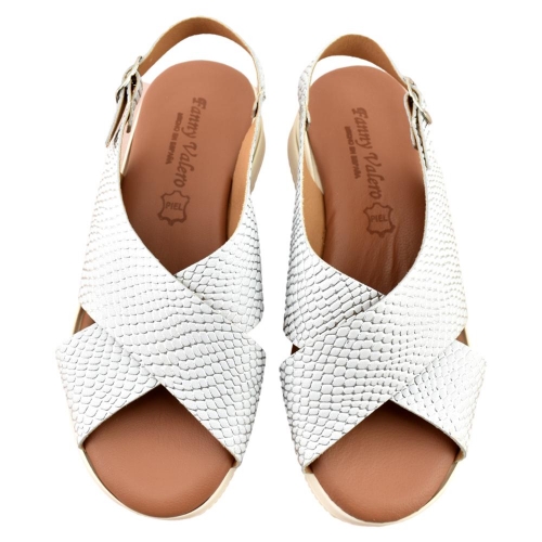 FABRICADO EN ESPAÑA. Sandalia de piel grabada en color blanco con tira trasera y cierre de hebilla. Incorpora planta de gel que aporta máxima comodidad en cada pisada. Sus tiras cruzadas permiten adaptarse a cualquier pie. Un modelo ideal que podrás lucir con cualquier outfit este verano.