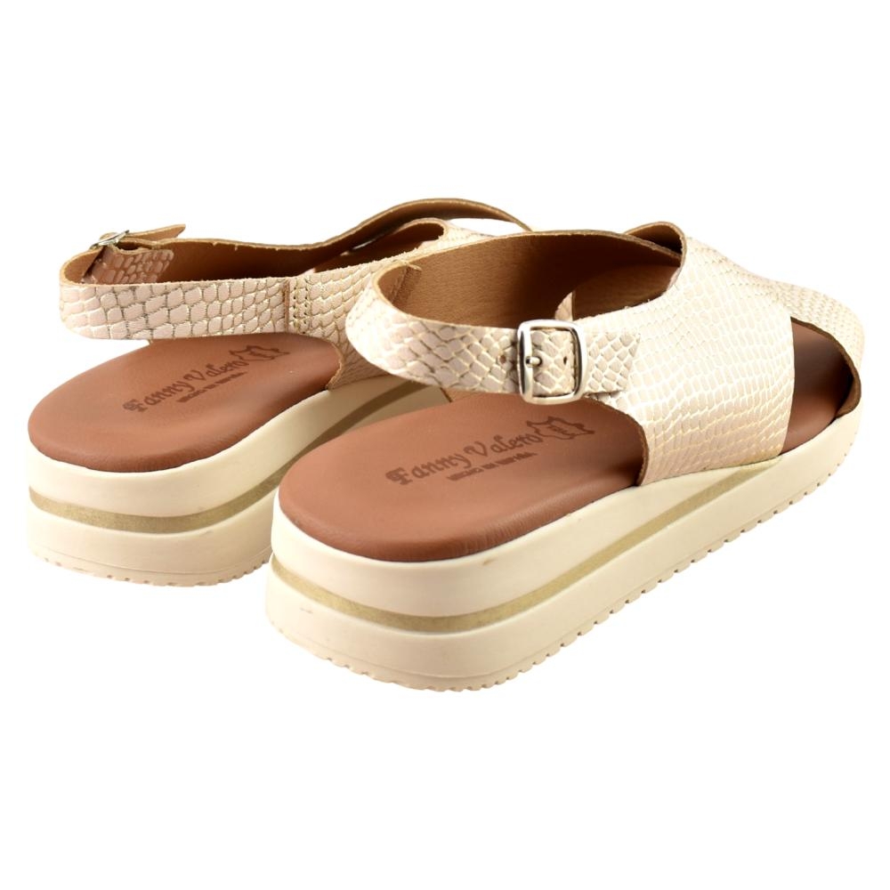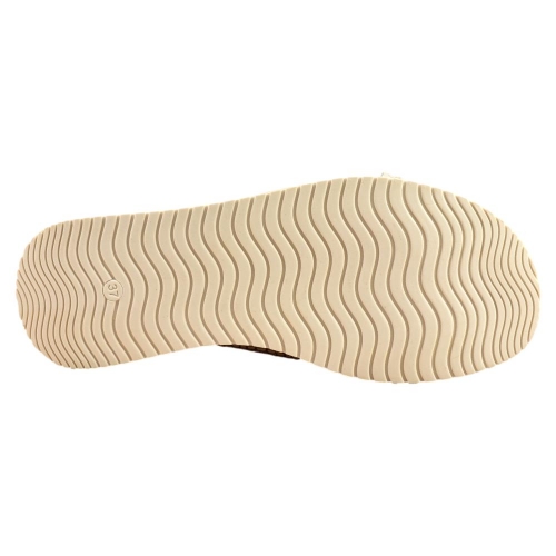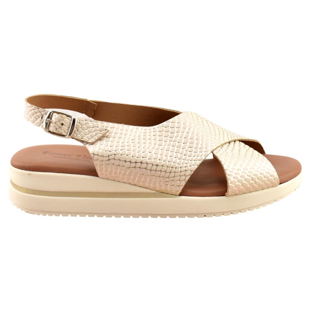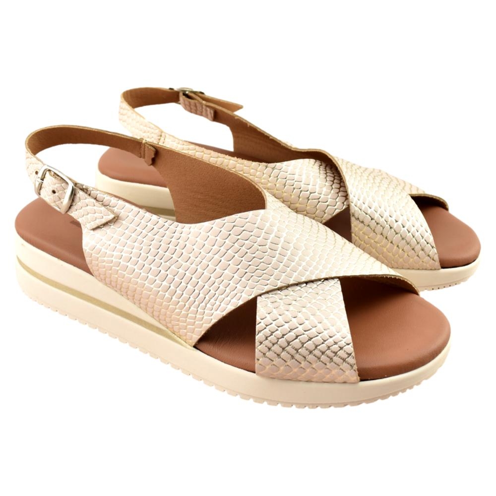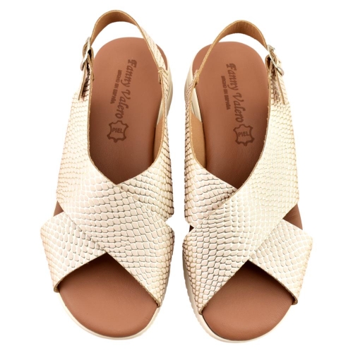 FABRICADO EN ESPAÑA. Sandalia de piel grabada en color oro con tira trasera y cierre de hebilla. Incorpora planta de gel que aporta máxima comodidad en cada pisada. Sus tiras cruzadas permiten adaptarse a cualquier pie. Un modelo ideal que podrás lucir con cualquier outfit este verano.