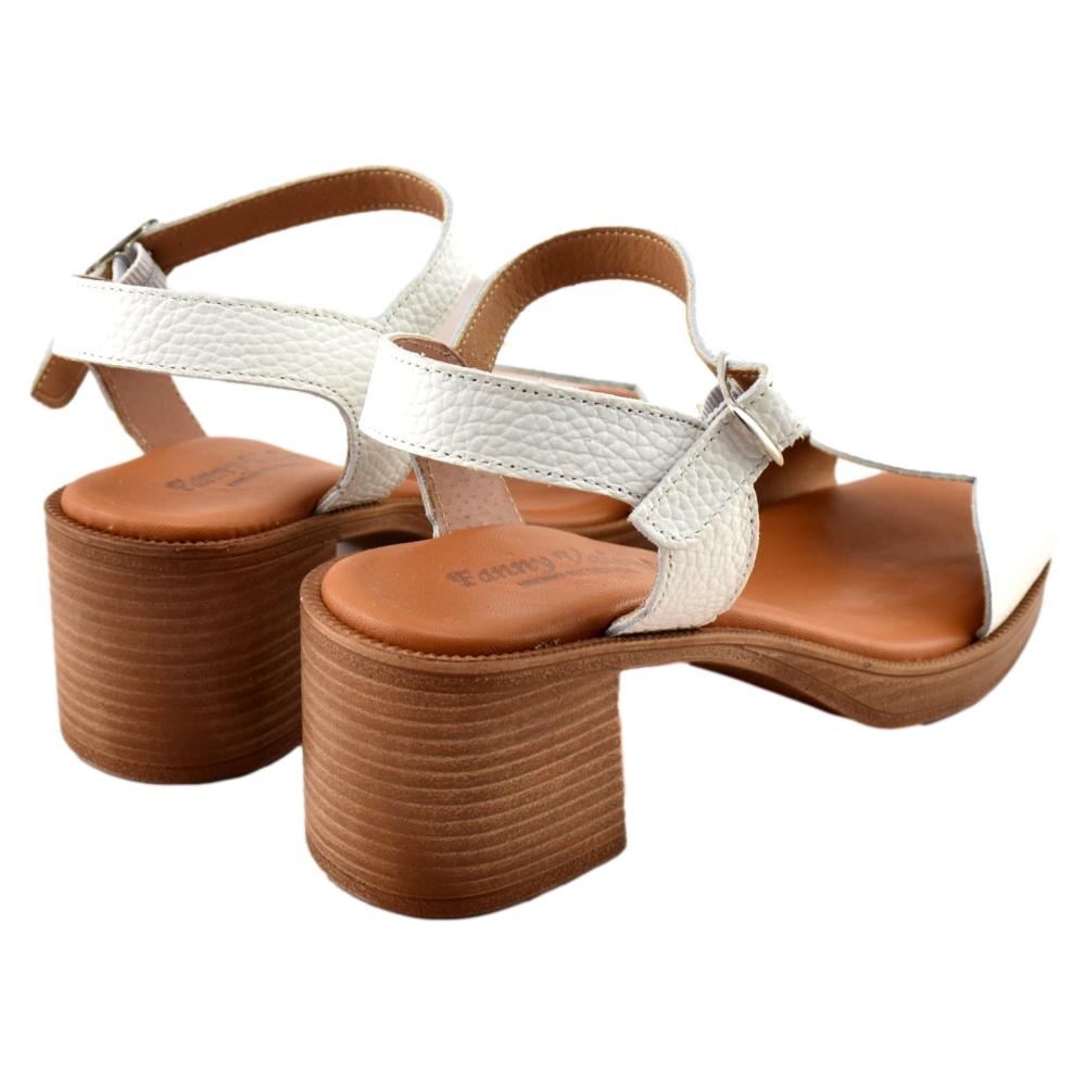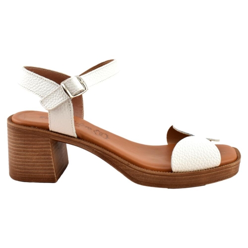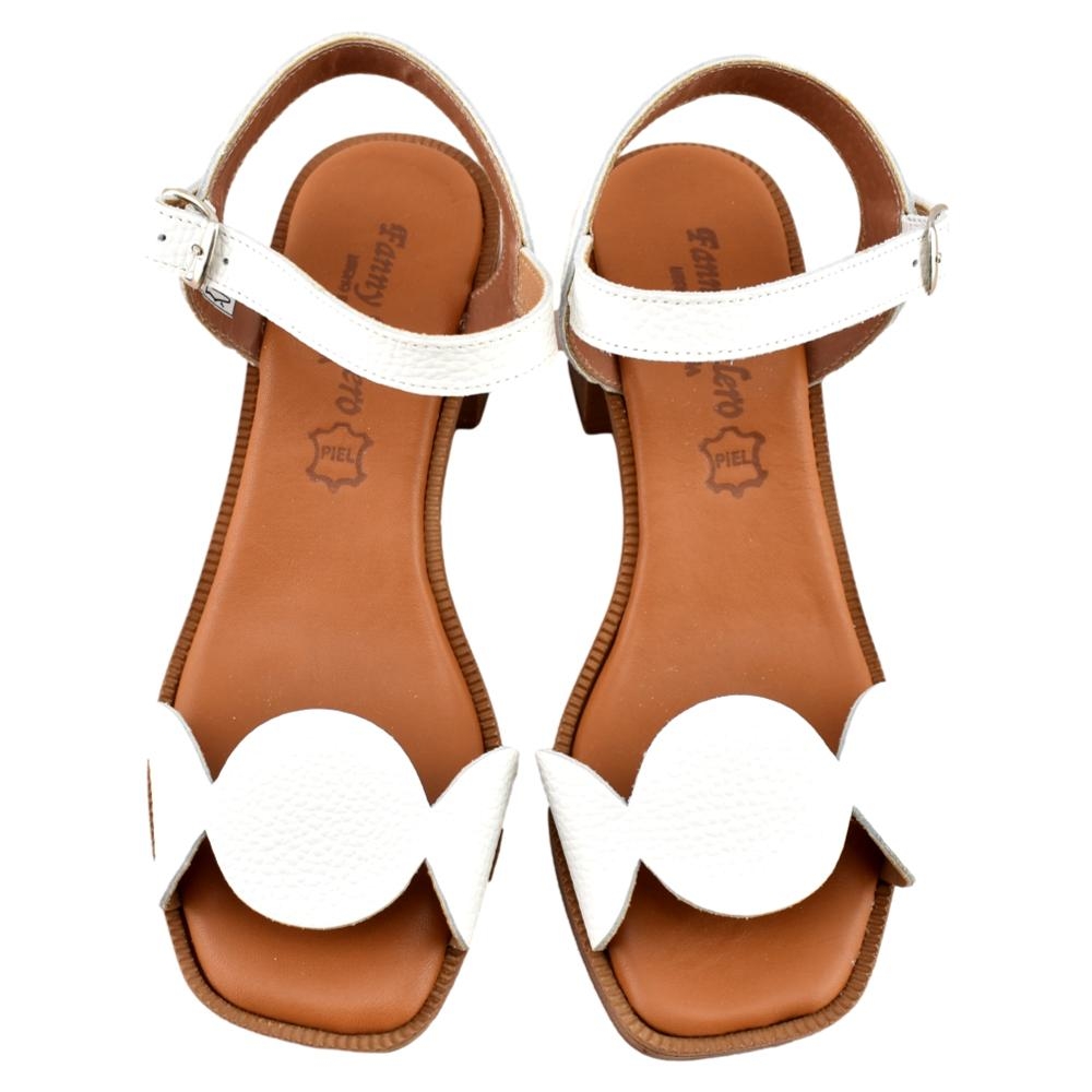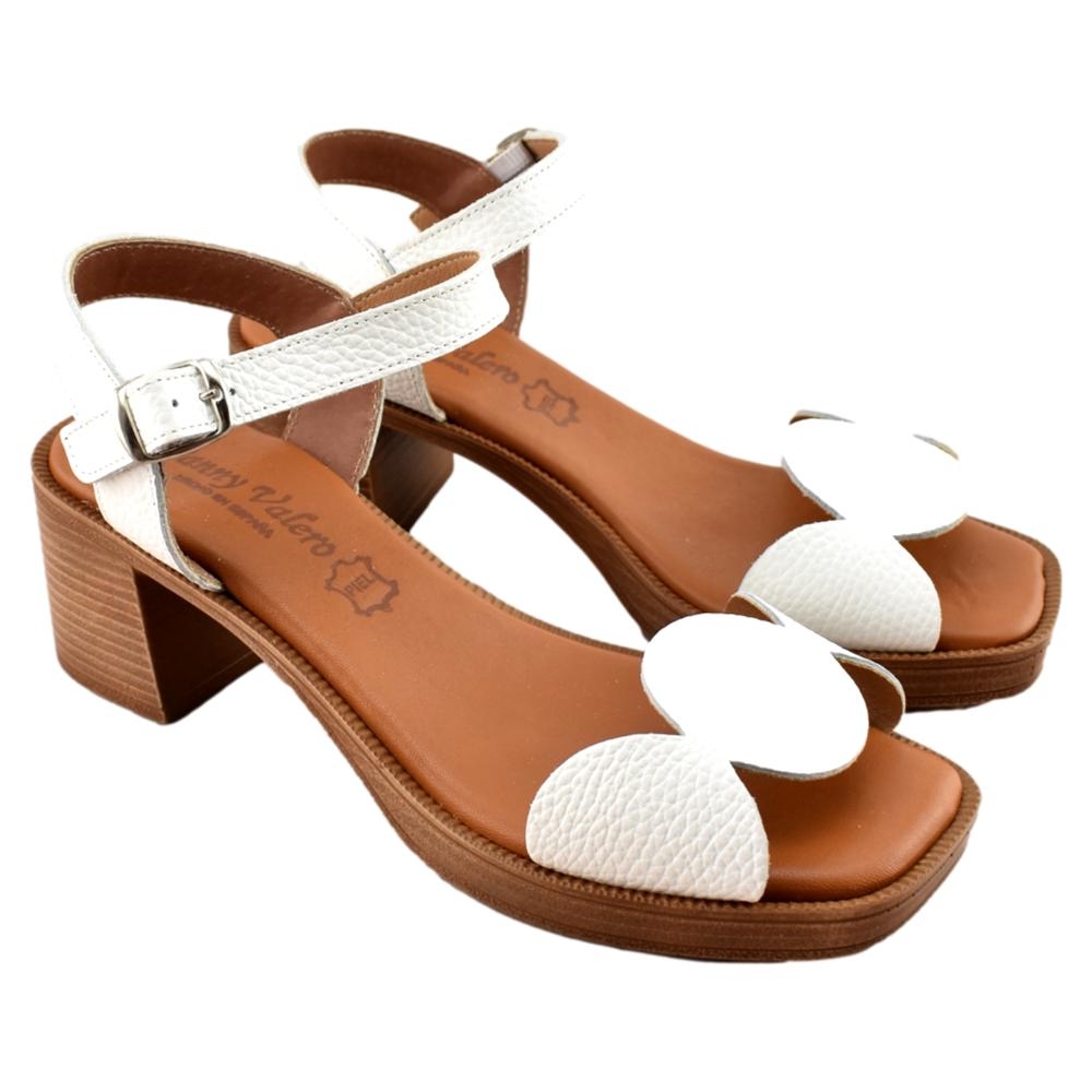FABRICADO EN ESPAÑA. Sandalias de mujer con tacón fabricada en piel color blanco. Diseño original en su parte delantera y cierre de hebilla para mayor sujeción y comodidad. Suela con tacón ancho y planta acolchada. Modelo ideal para lucir  pies bonitos en cualquier ocasión.