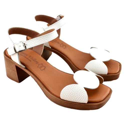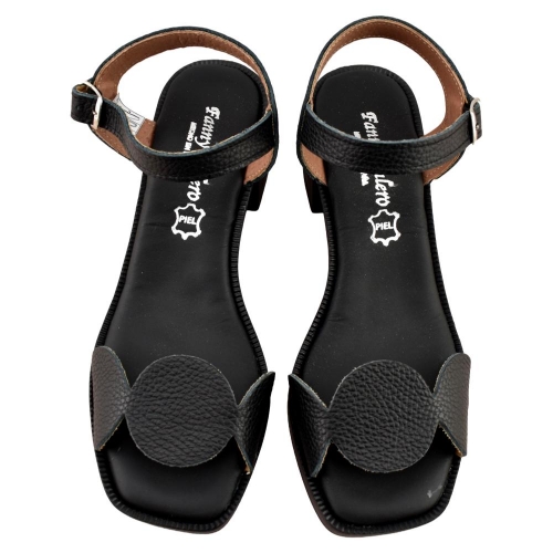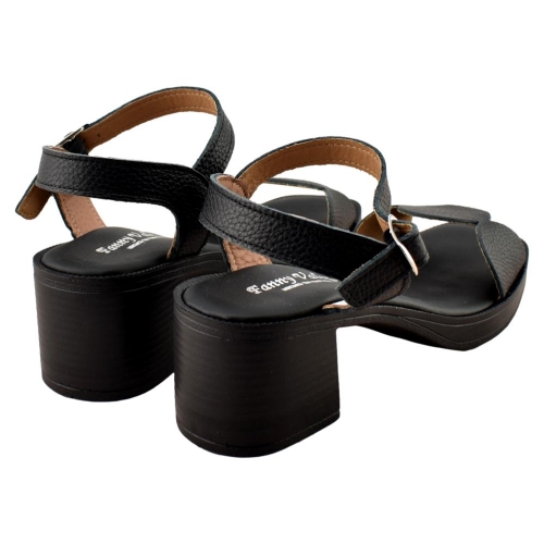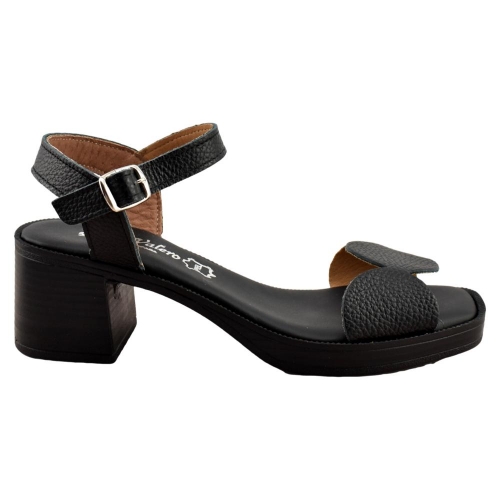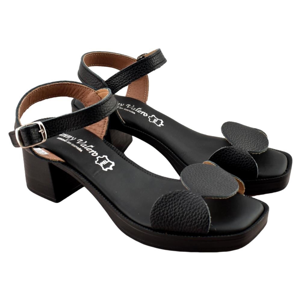 FABRICADO EN ESPAÑA. Sandalias de mujer con tacón fabricada en piel color negro. Diseño original en su parte delantera y cierre de hebilla para mayor sujeción y comodidad. Suela con tacón ancho y planta acolchada. Modelo ideal para lucir  pies bonitos en cualquier ocasión.