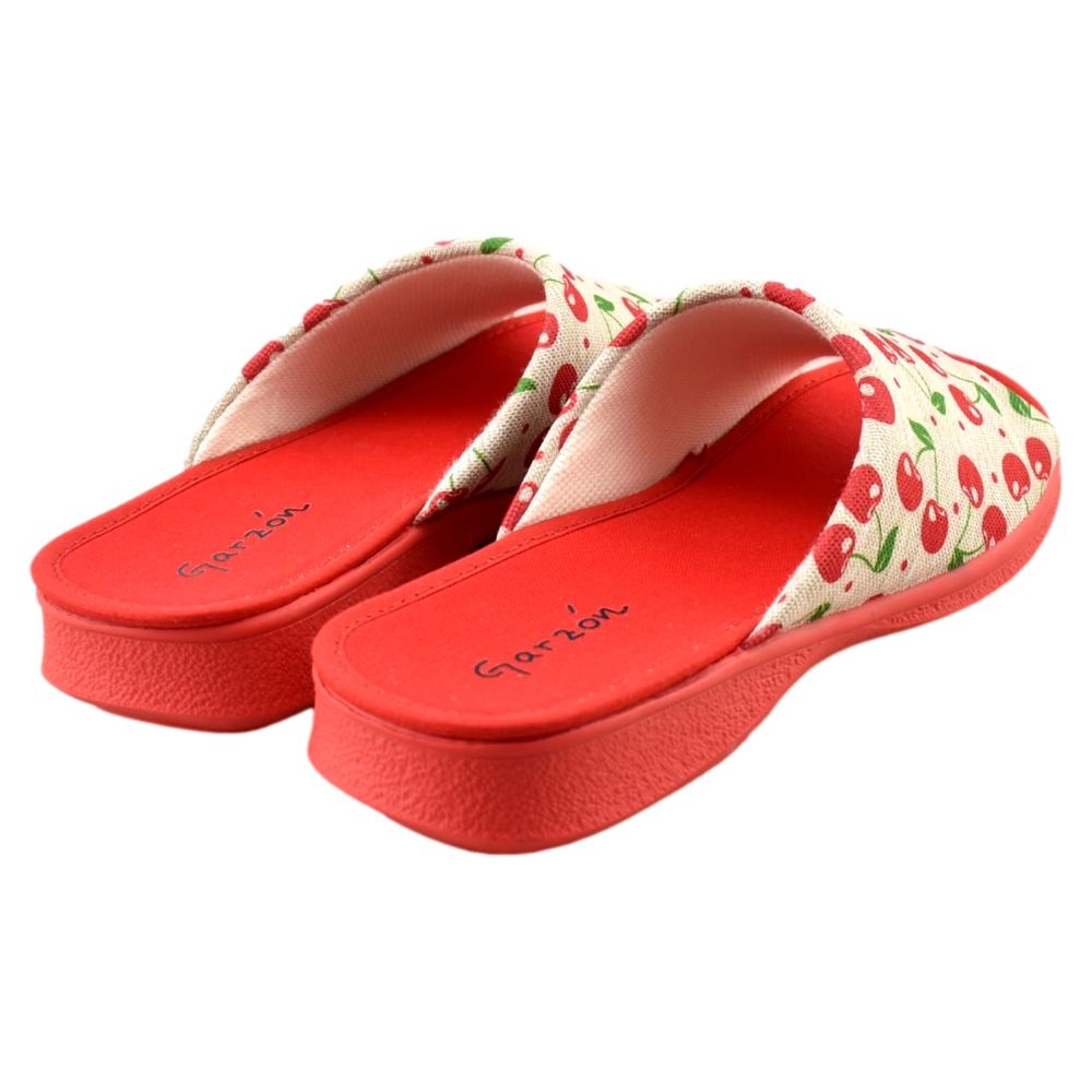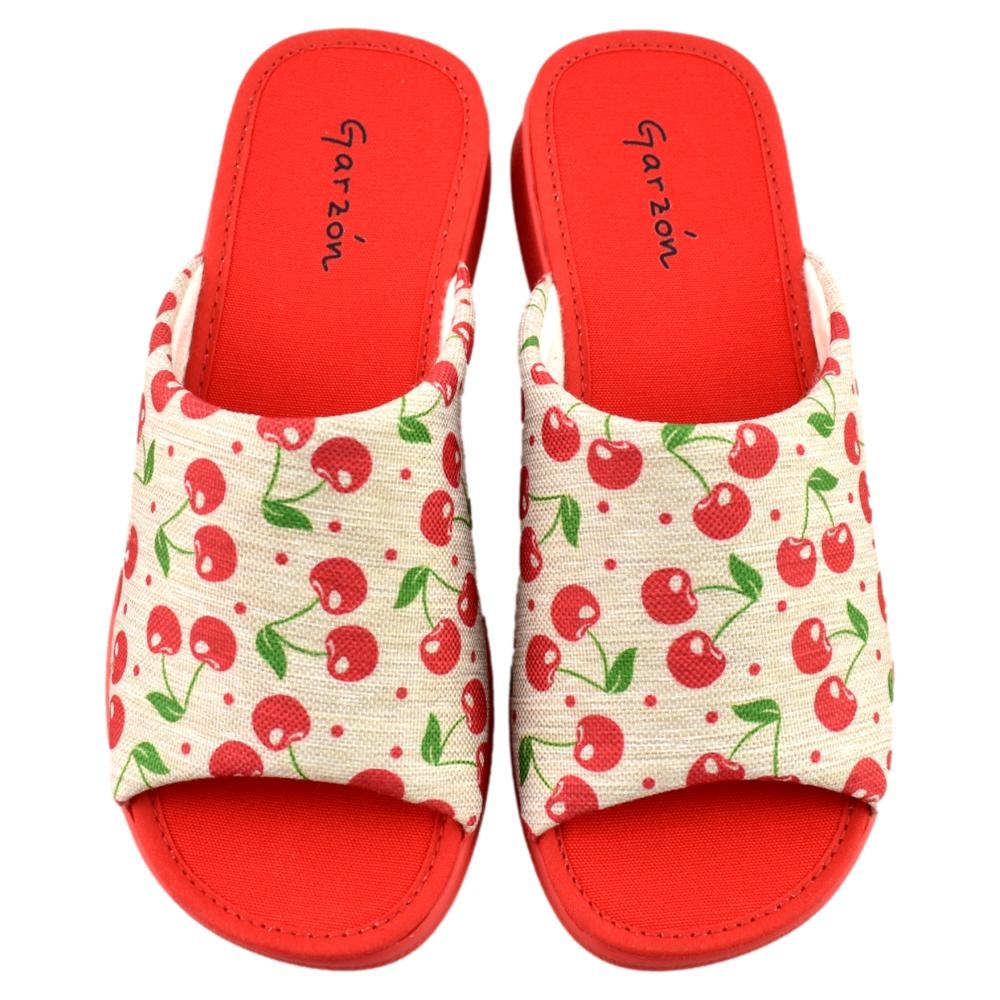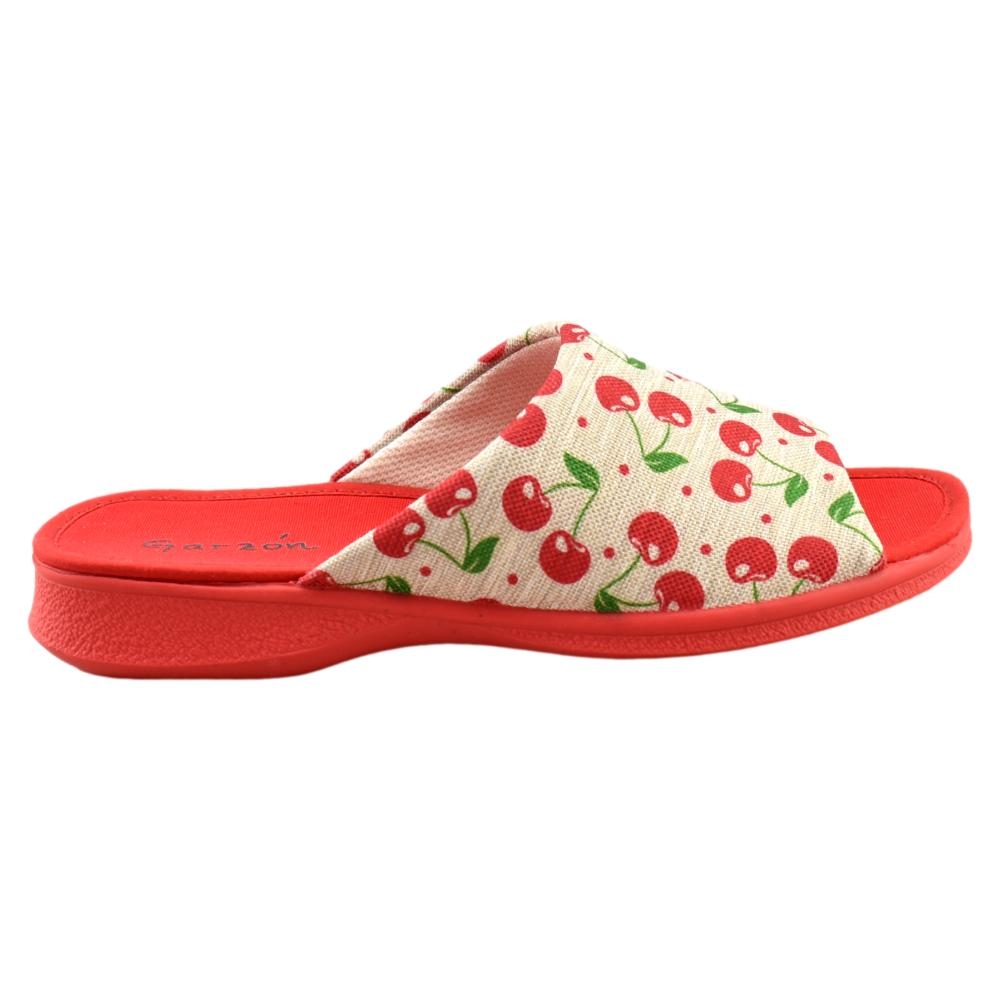 FABRICADO EN ESPAÑA. Zapatillas fabricadas con materiales de 1ª calidad. Tejido muy fresco y suave al tacto con alegre estampado de cerezas en tonos rojo. Piso de goma flexible.