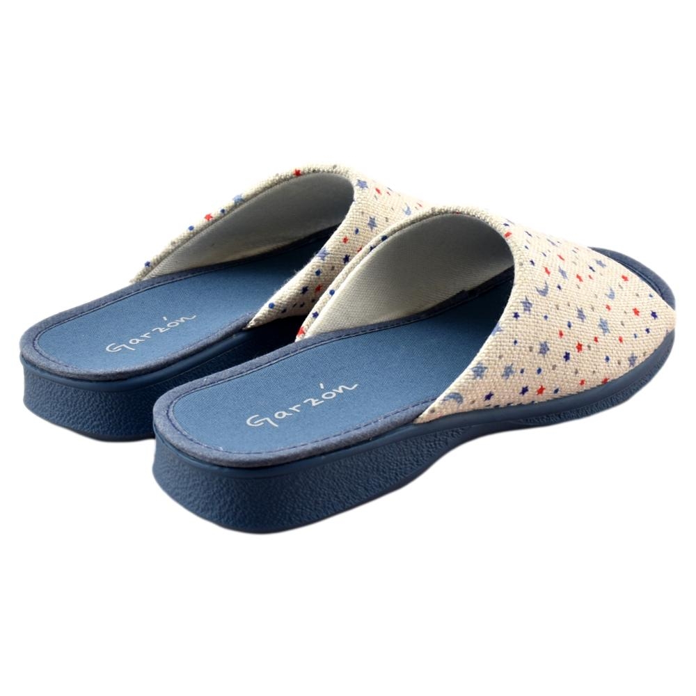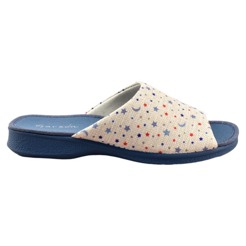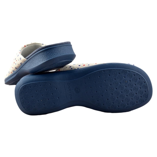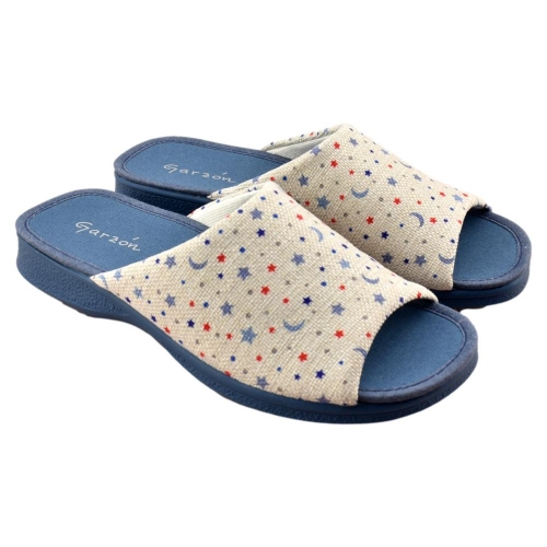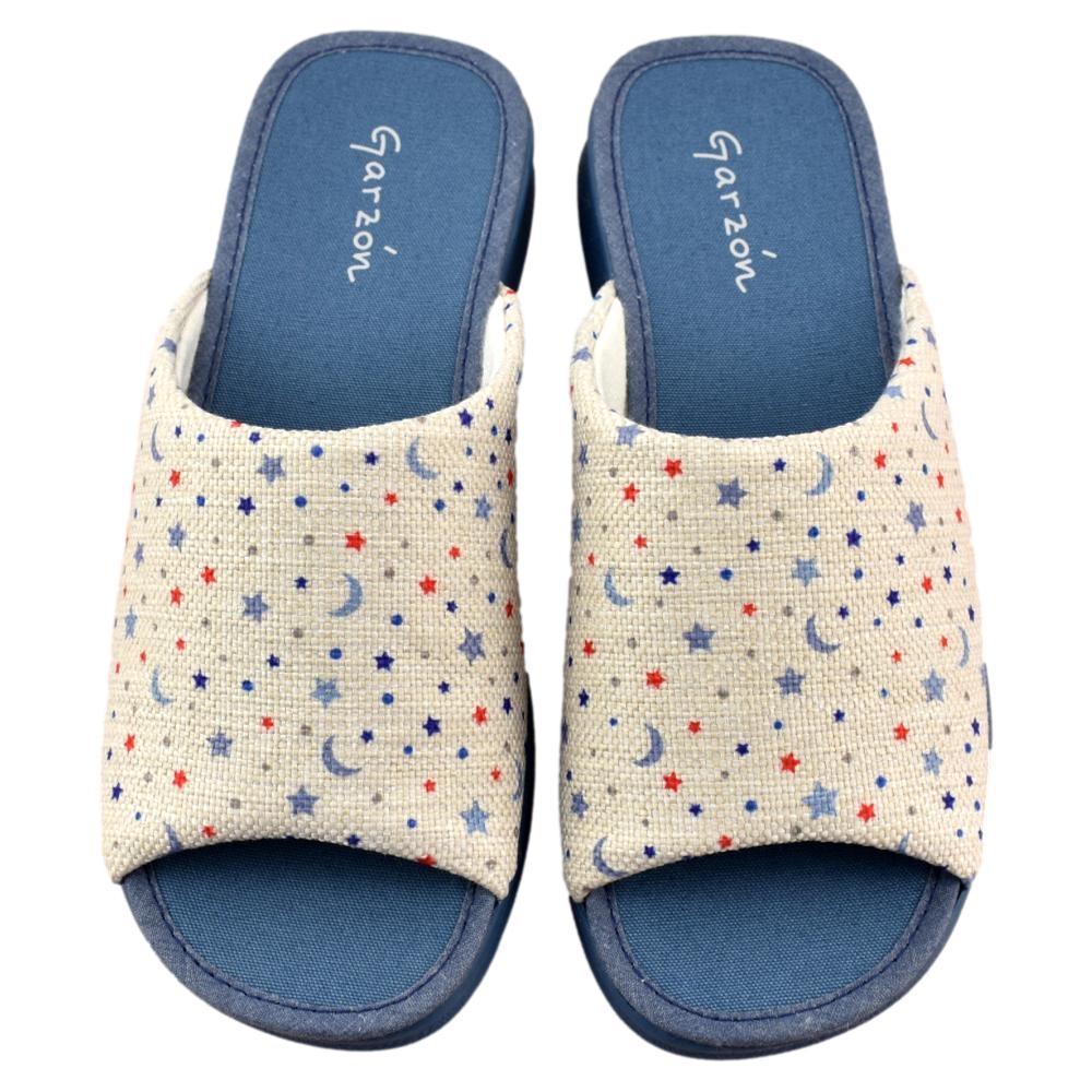 FABRICADO EN ESPAÑA. Zapatillas fabricadas con materiales de 1ª calidad. Tejido muy fresco y suave al tacto con alegre estampado en tonos beig y azul. Piso de goma flexible.