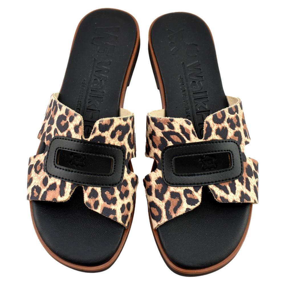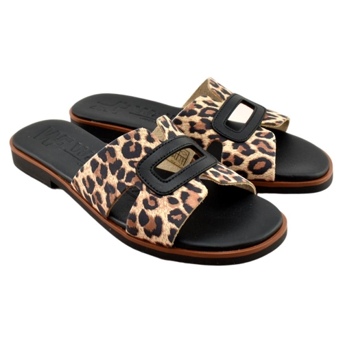 FABRICADO EN ESPAÑA. ¡Las chanclas negras más especiales de la temporada! Si te encanta el estampado animal, estas sandalias planas de leopardo se convertirán en tu calzado favorito este verano. Te enamorarás en cuanto te las pruebes. Igualmente cómodas y ligeras, estas chanclas de estampado de leopardo realzan cualquier look sin necesidad de tacones. Son la sandalia ideal para llevar de la mañana a la noche con total comodidad. Plantillas acolchadas para mayor confort y suela antideslizante. El estampado de leopardo resalta sobre el cuero negro, creando un estilo versátil que combinará con todos tus conjuntos. Descubre la comodidad de estas sandalias planas para mujer, hechas a mano en España con suave cuero natural, para que sientas una caricia cada vez que las uses.