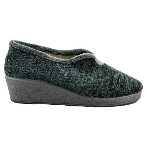 FABRICADO EN ESPAÑA. Zapatillas de casa de mujer. Tejido muy cálido y suave de rayas con fondo en color gris. Piso de goma antideslizante y flexible con cuña de 5cm.