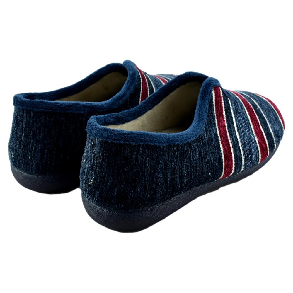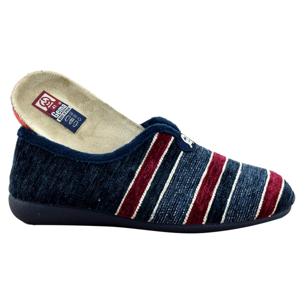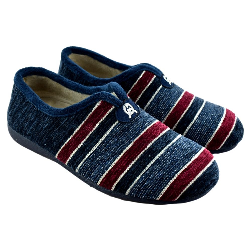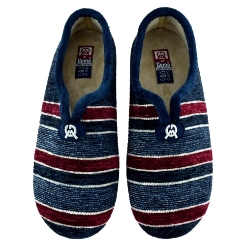 FABRICADO EN ESPAÑA. Zapatillas de hombre con plantilla extraíble y piso de goma antideslizante. Diseño a rayas sobre fondo azul.