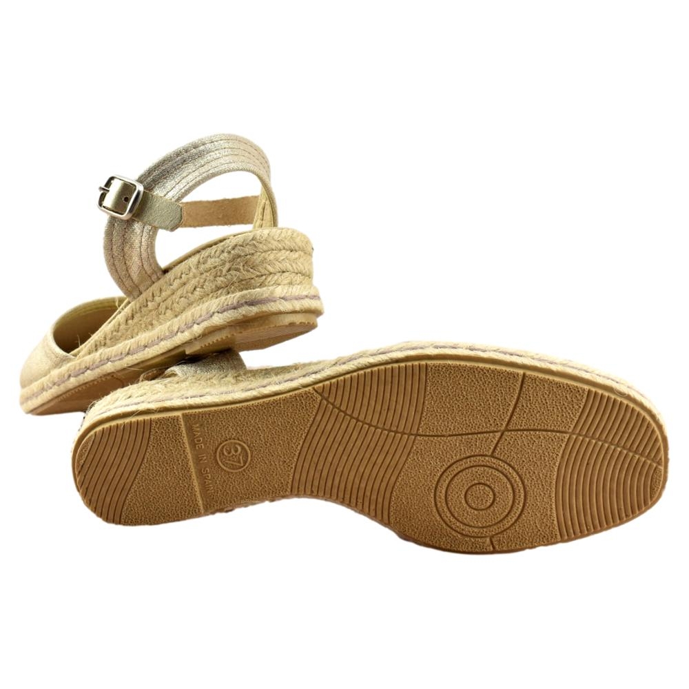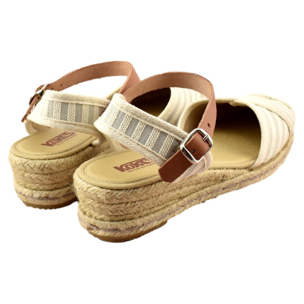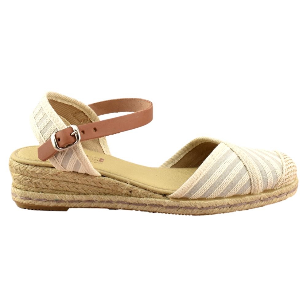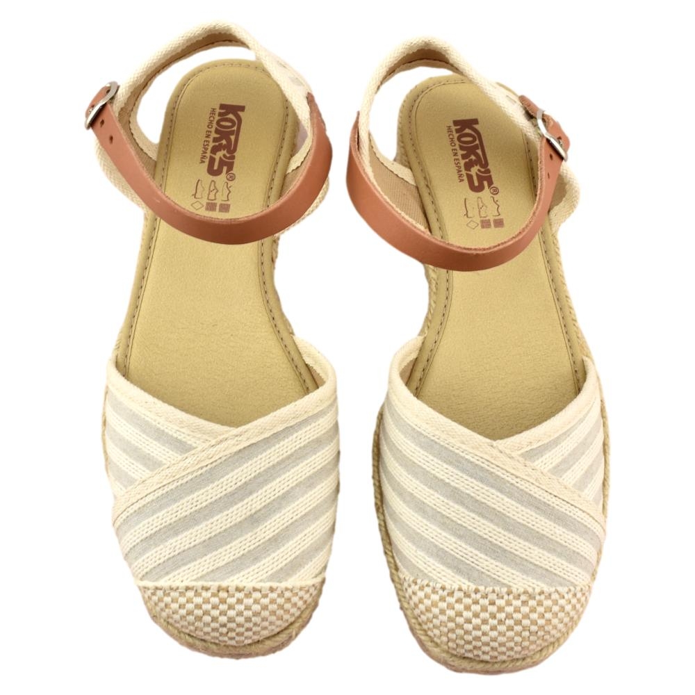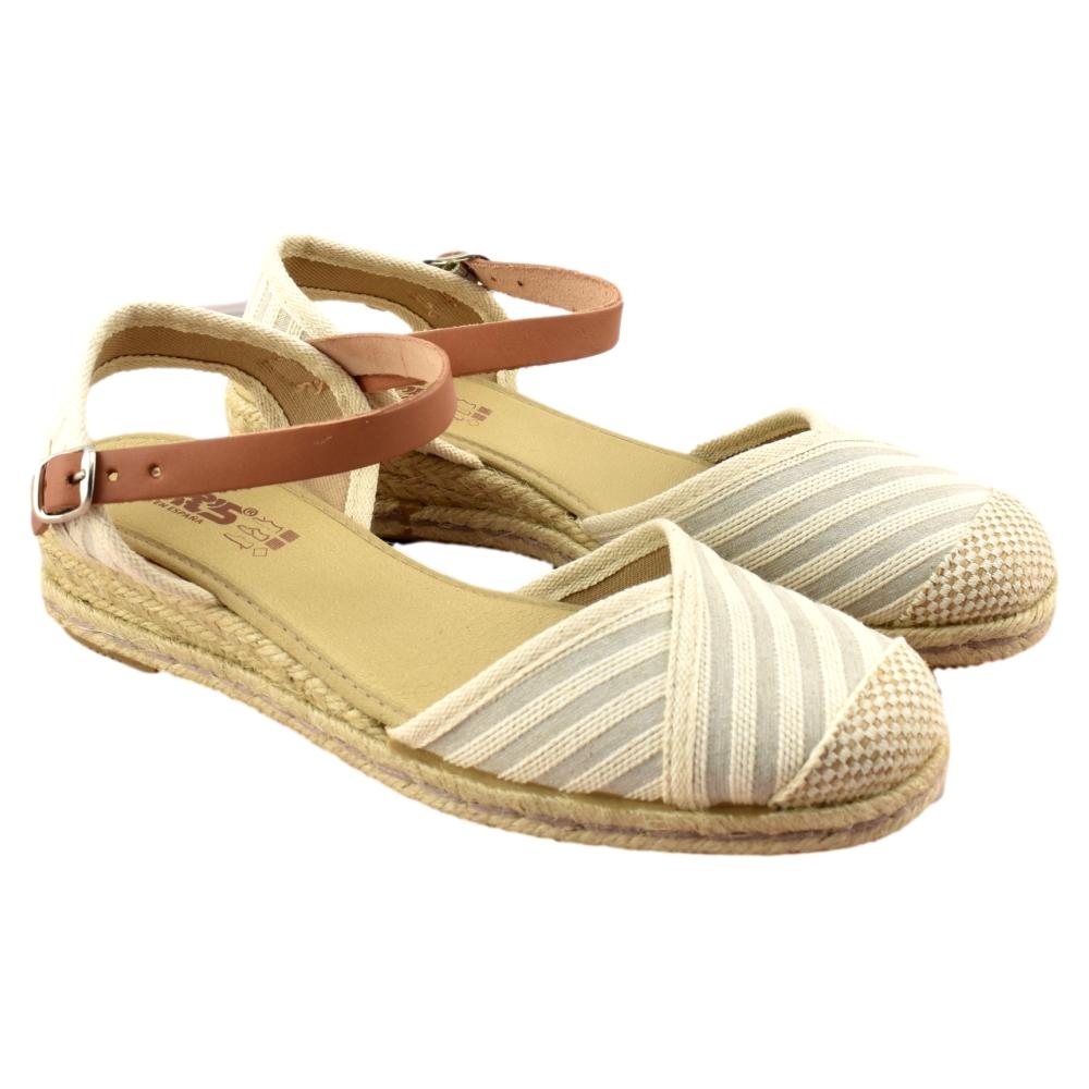 FABRICADO EN ESPAÑA. Zapatillas de esparto de 2 cuerdas y 4cm de altura. Pala textil de rayas en color beig y correa cuero al tobillo con cierre de hebilla. Piso flexible y plantilla acolchada.