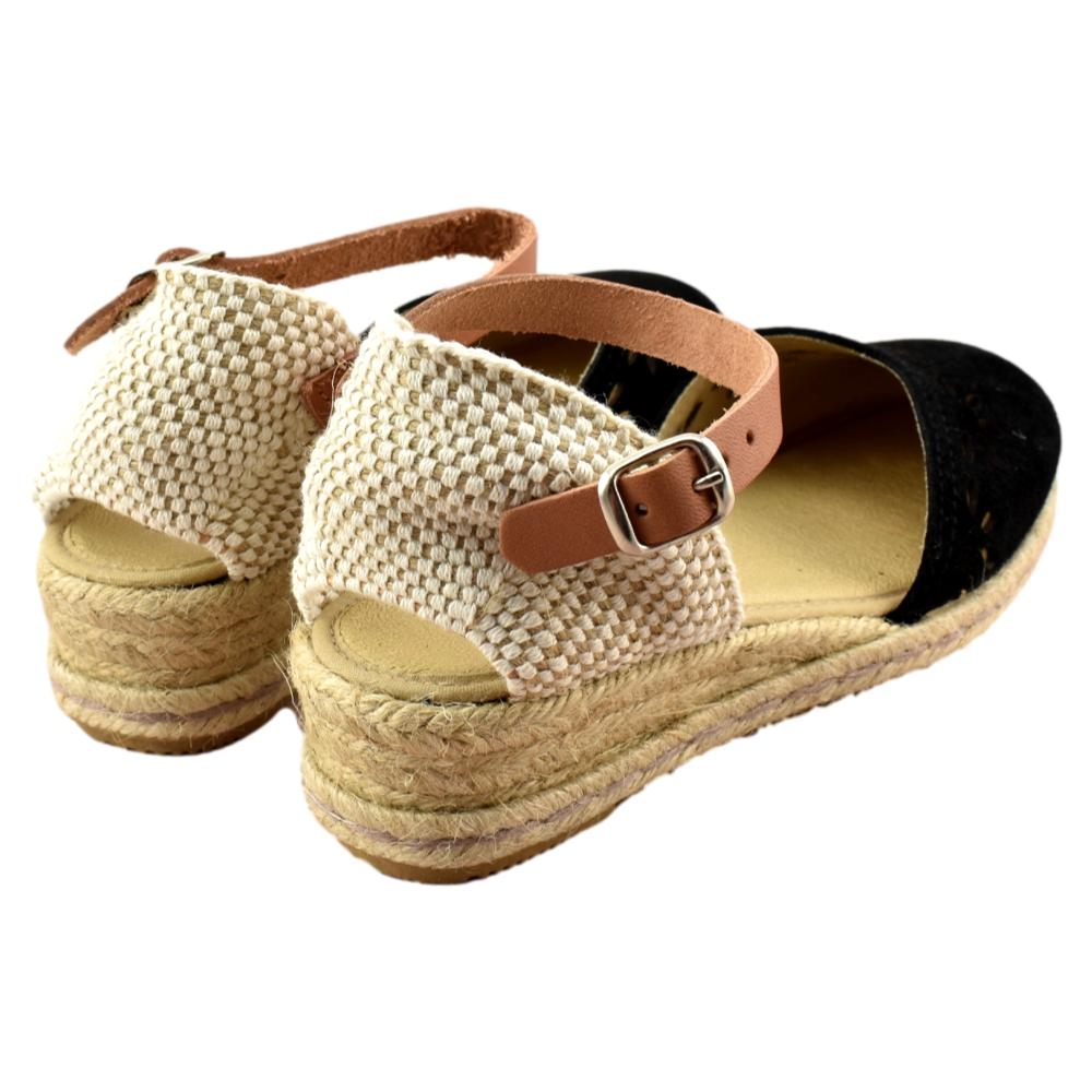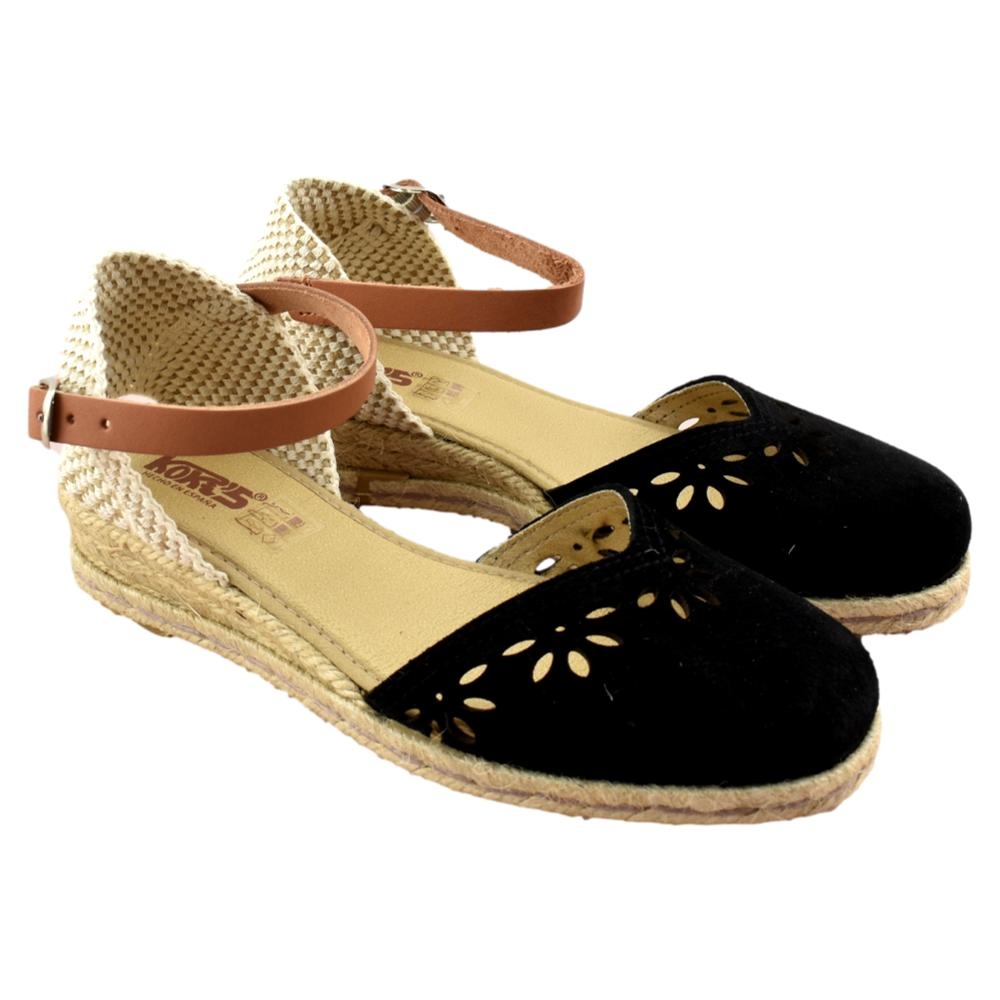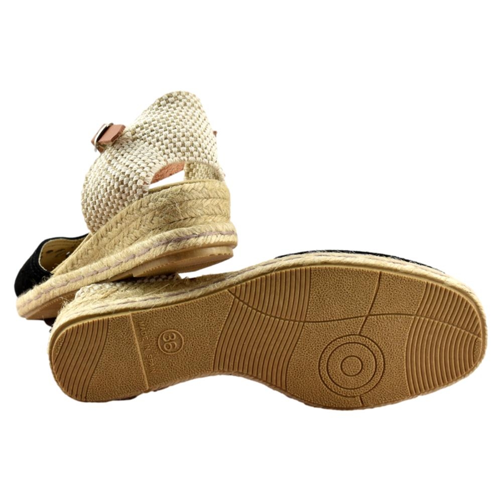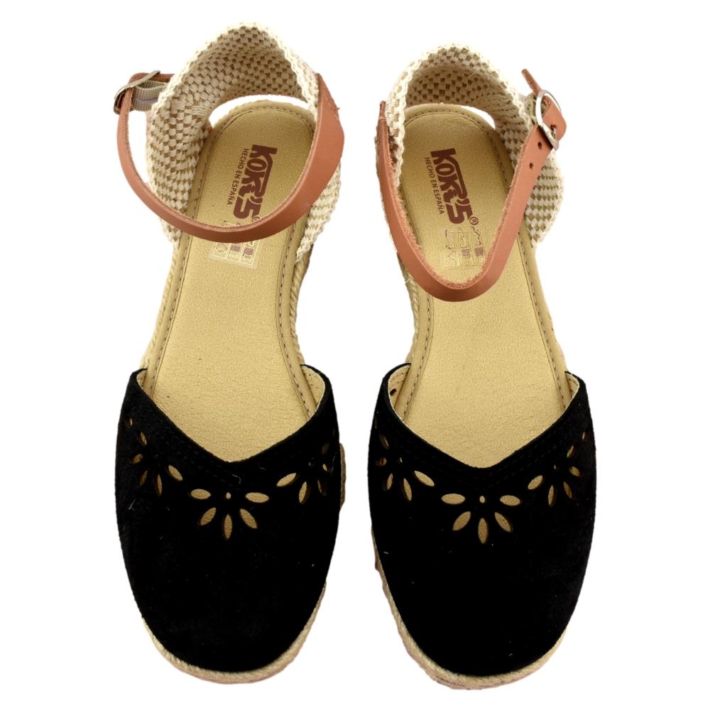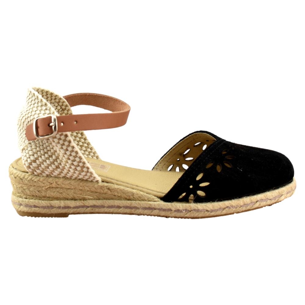 FABRICADO EN ESPAÑA. Zapatillas de esparto de 2 cuerdas y 4cm de altura. Pala de piel calada en color negro y correa cuero al tobillo con cierre de hebilla. Piso flexible y plantilla acolchada.