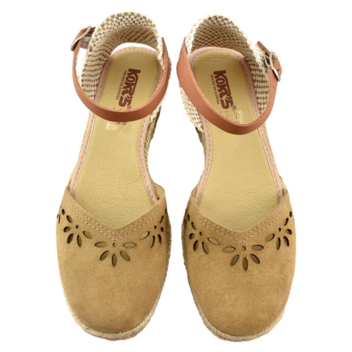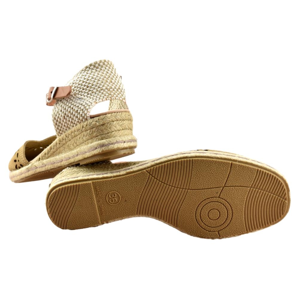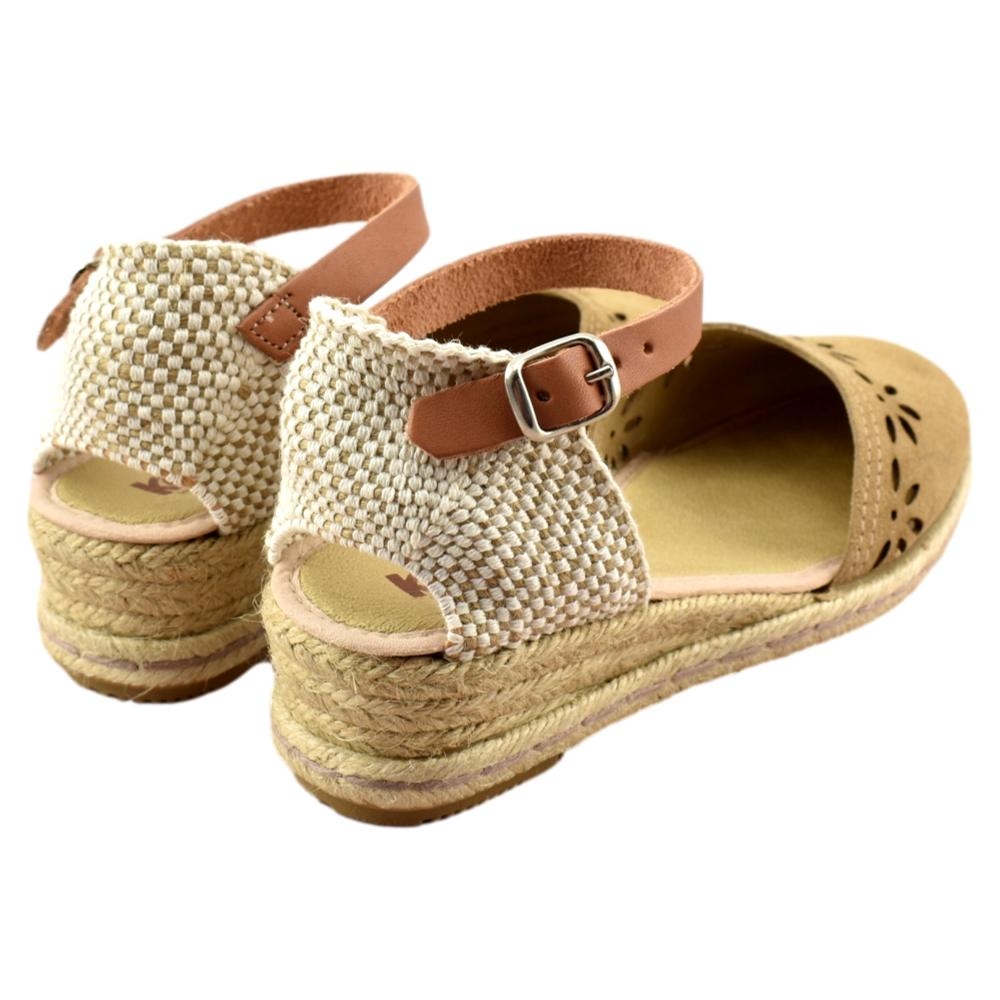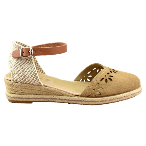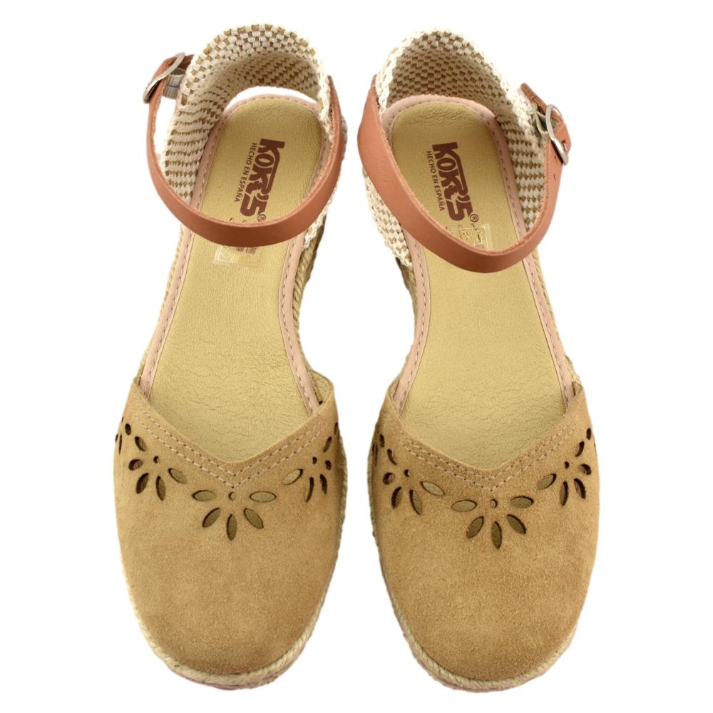 FABRICADO EN ESPAÑA. Zapatillas de esparto de 2 cuerdas y 4cm de altura. Pala de piel calada en color tostado y correa cuero al tobillo con cierre de hebilla. Piso flexible y plantilla acolchada.