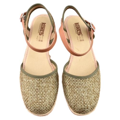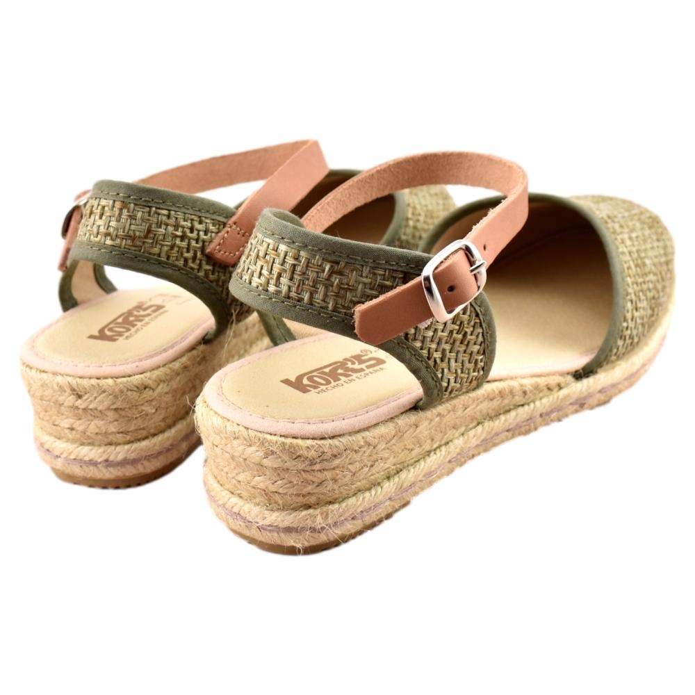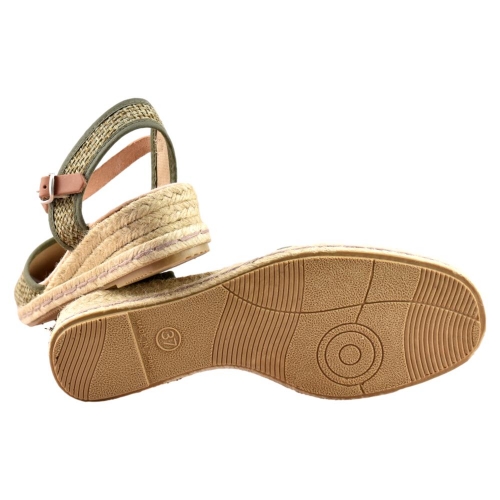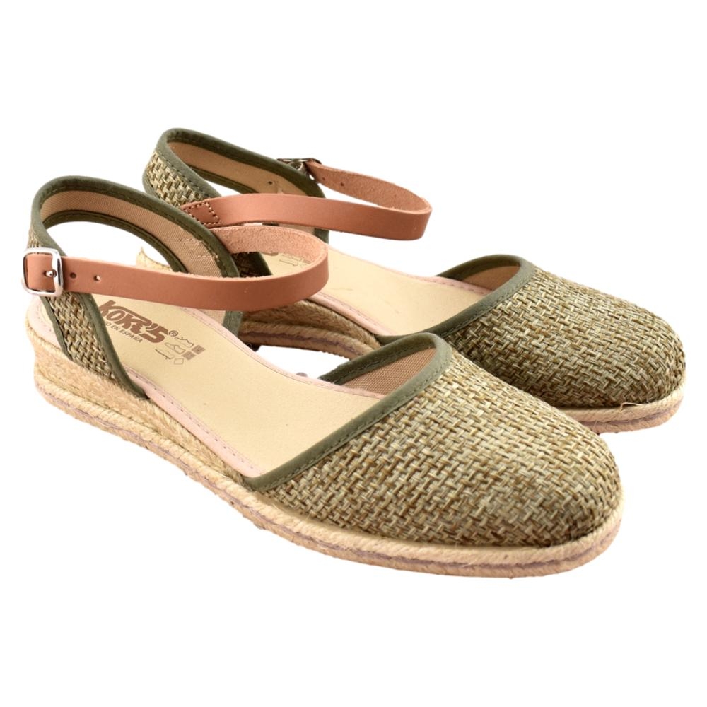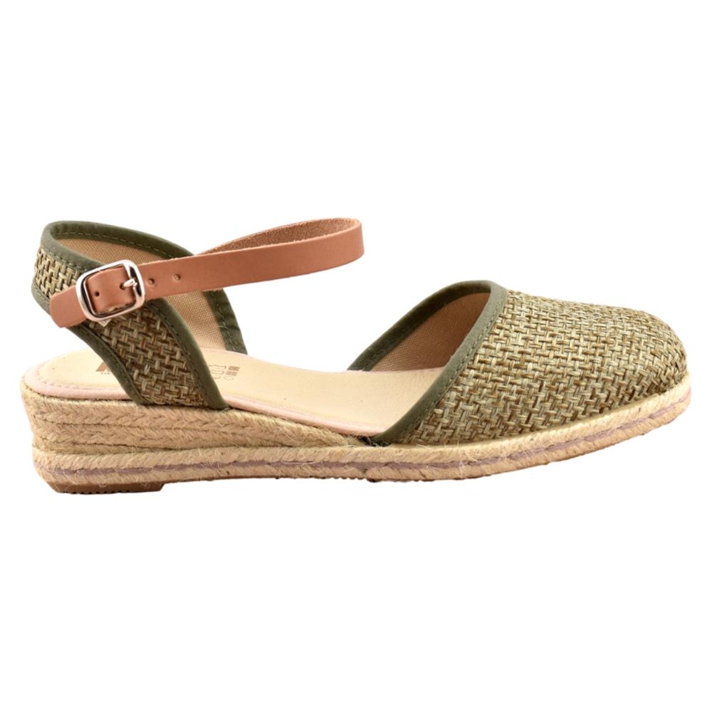 FABRICADO EN ESPAÑA. Zapatillas de esparto de 2 cuerdas y 4cm de altura. Pala textil en color kaki y correa cuero al tobillo con cierre de hebilla. Piso flexible y plantilla acolchada.