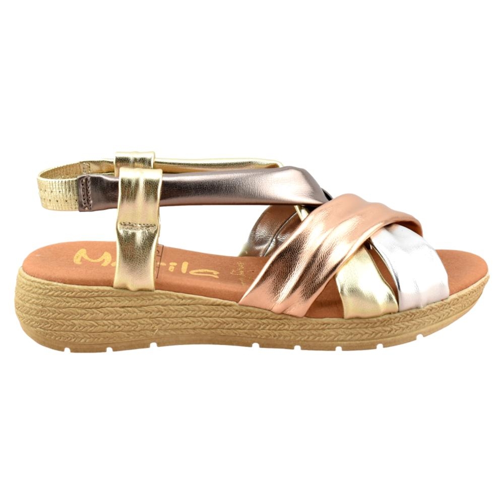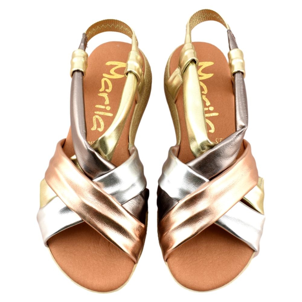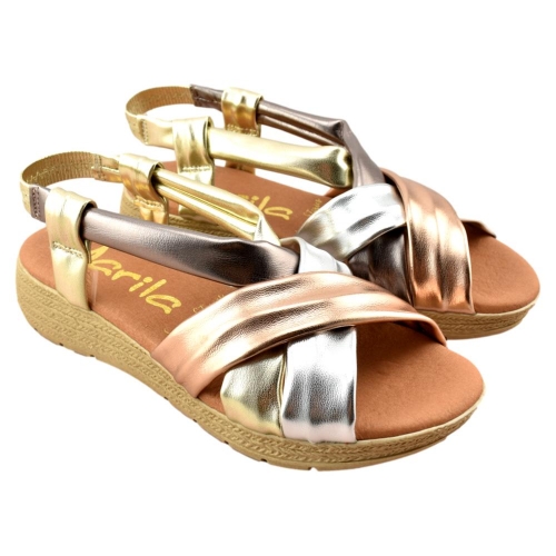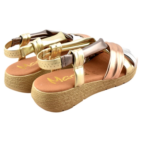 FABRICADO EN ESPAÑA. Sandalias con cuña baja para mujer fabricadas en piel multimetal. Su estructura está compuesta por cintas que cruzan entre sí combinadas en tonos metalizados. El talón queda al descubierto y dispone de un elástico trasero como cierre. Máximo confort gracias a la plantilla acolchada de 5mm. Calzado ligero y confortable.
