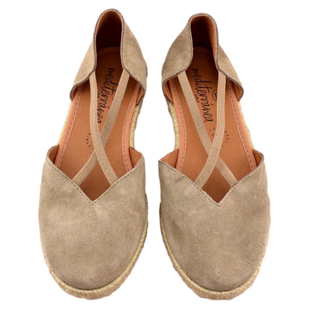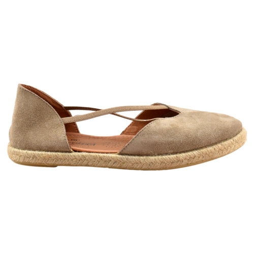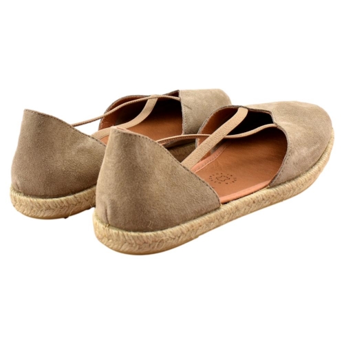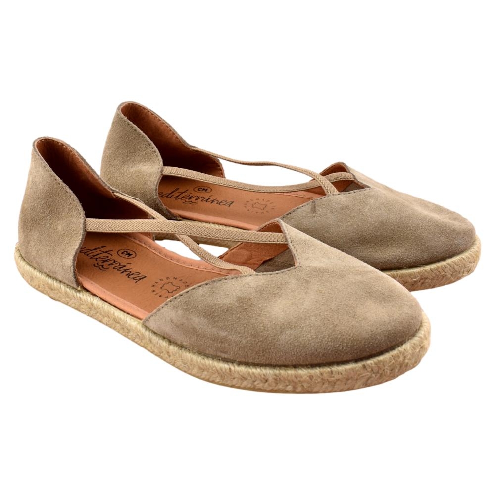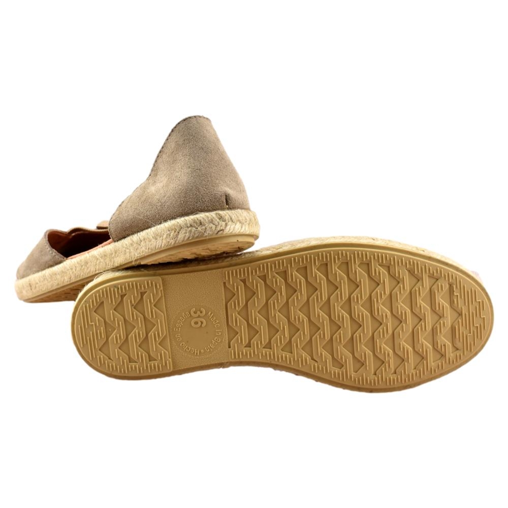 FABRICADO EN ESPAÑA. Alpargata de esparto plana. Piso de goma flexible y plantilla de piel acolchada. Fabricada en piel de serraje en color piedra con elásticos cruzados en el empeine que aportan máxima sujeción y comodidad.