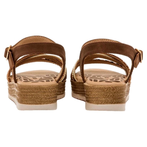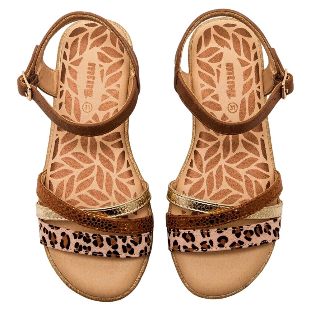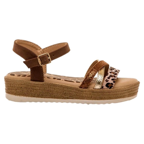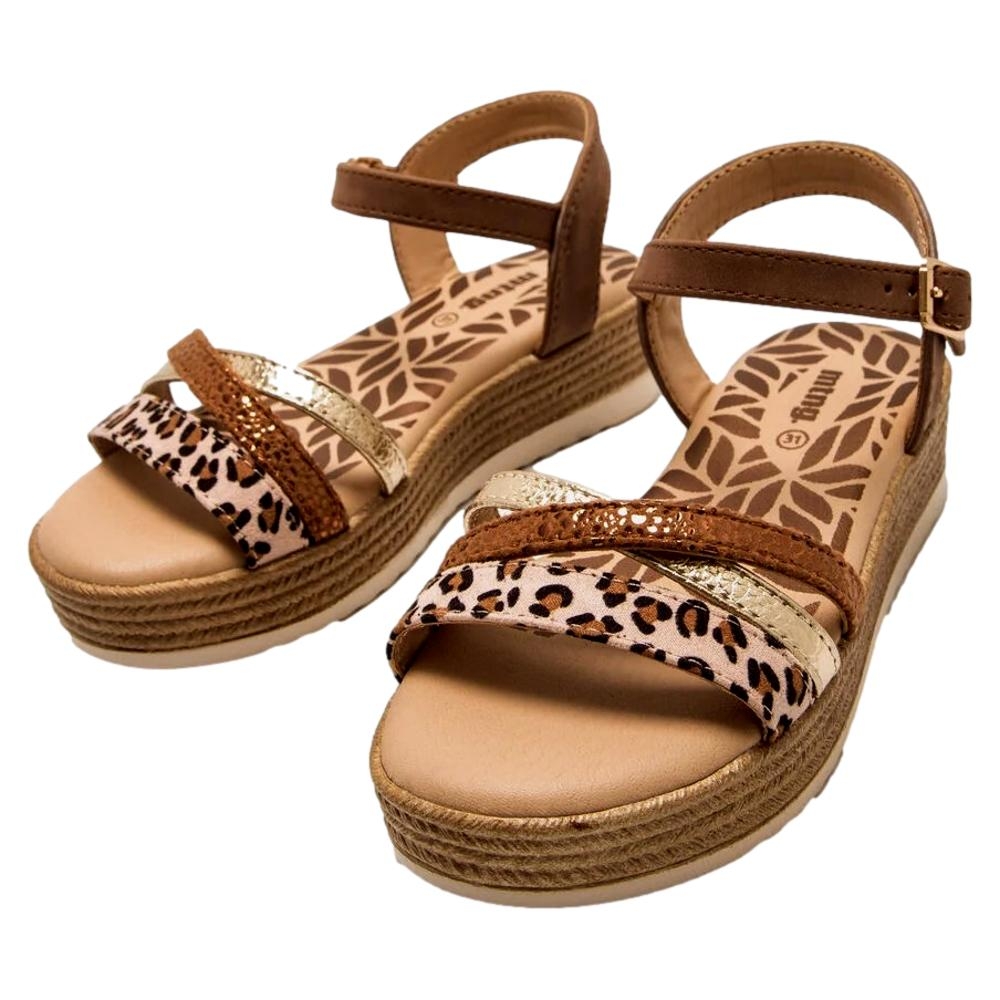 Sandalias de color marrón para niña, modelo Aire de Mustang con plataforma tipo esparto. Este diseño combina tiras de acabado metalizado en tono dorado y marrón, y una banda frontal con animal print de leopardo que aporta un toque actual. Incorpora cierre de hebilla ajustable al tobillo para mayor sujeción y plantilla acolchada. La cuña ligera con acabado trenzado refuerza su aire veraniego, ideal para acompañar vestidos y conjuntos frescos.