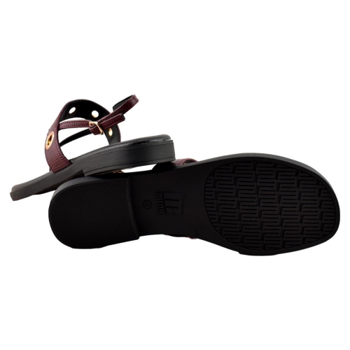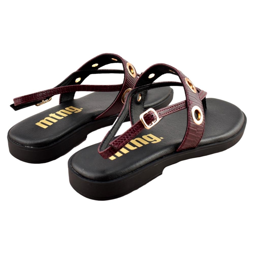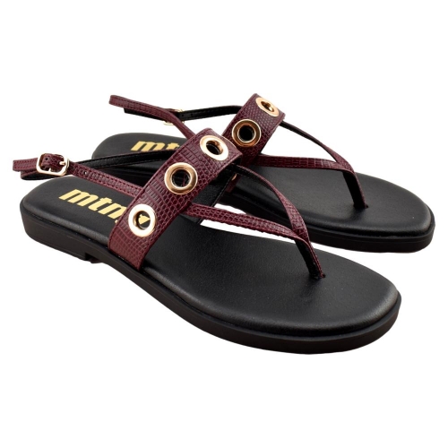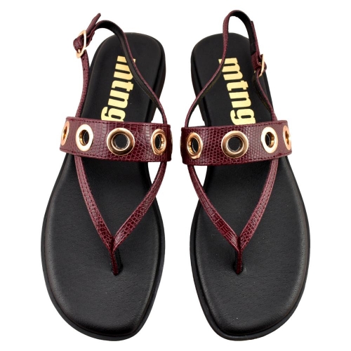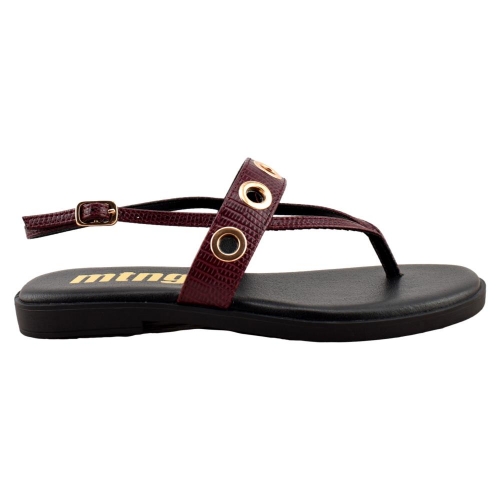 Sandalia plana de color burdeos para mujer, modelo Alysa de la marca Mustang. Diseñada con tiras finas al dedo y detalle de arandelas metálicas doradas en la pala, aporta un toque actual y llamativo. Incorpora cierre de pulsera con hebilla al tobillo que facilita un ajuste seguro y cómodo. Su planta acolchada y suela plana favorecen una pisada confortable. Una opción versátil para completar looks informales con personalidad.