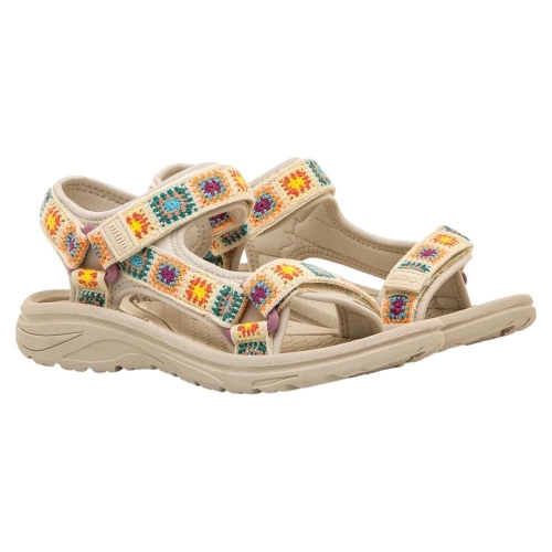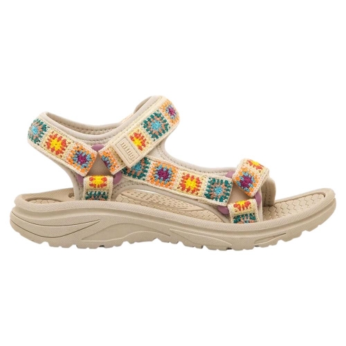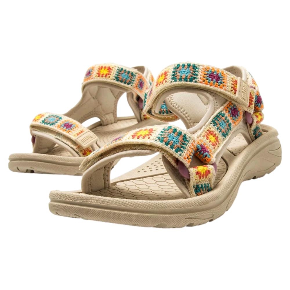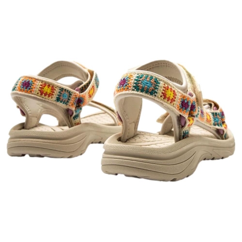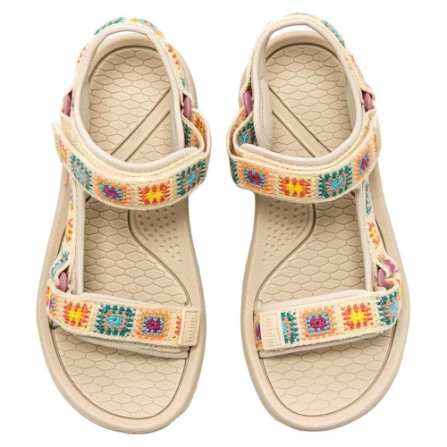 Sandalia tipo sport de color beige para mujer, modelo Solana de la marca Mustang. Incorpora tiras ajustables con cierre adhesivo y diseño multicolor de estilo crochet, que aporta un toque artesanal y original. La suela gruesa y ligeramente curvada mejora la pisada y aporta comodidad. Perfecta para looks relajados y activos, es una opción funcional y diferente para los meses de calor. Con certificado VEGANO sellado por INESCOP, el cual garantiza que la naturaleza química principal del material no se corresponde con fibras de origen animal.