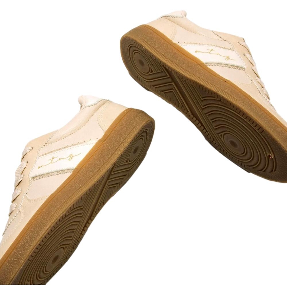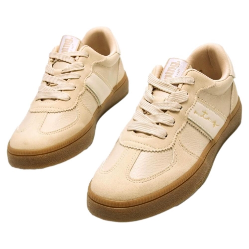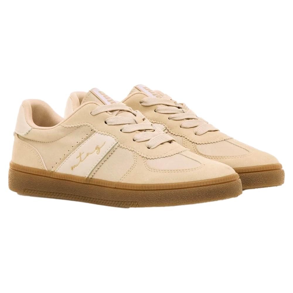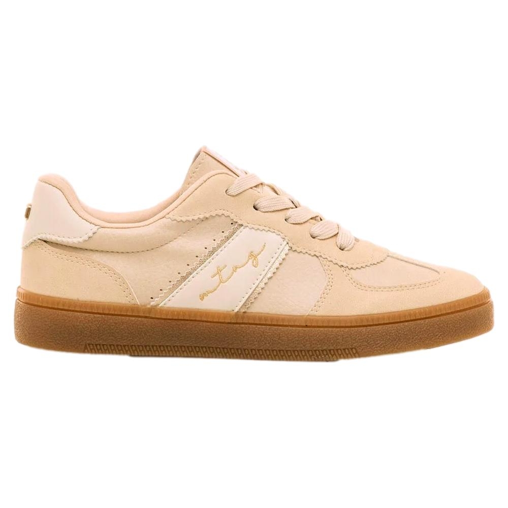 Zapatilla de color arena para mujer de la marca Mustang modelo Roy, estilo retro. Este diseño urbano destaca por su combinación de materiales con acabado en piel y detalles cosidos en los paneles laterales. Su suela de color caramelo y la firma bordada en el lateral aportan un toque distintivo y actual. Perfectas para el día a día, estas zapatillas se adaptan fácilmente a distintos looks casuales gracias a su versatilidad y comodidad. Un modelo clásico con esencia deportiva que nunca pasa de moda.