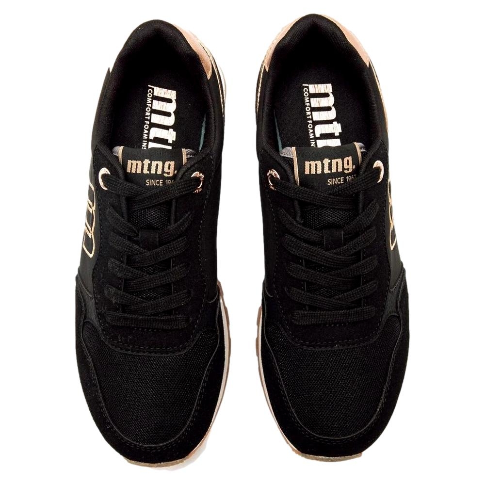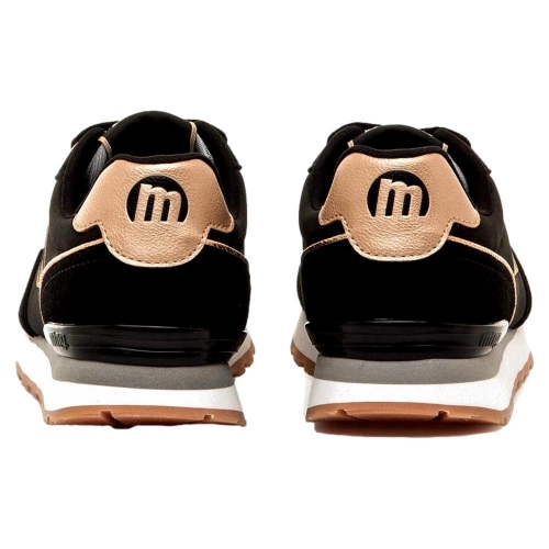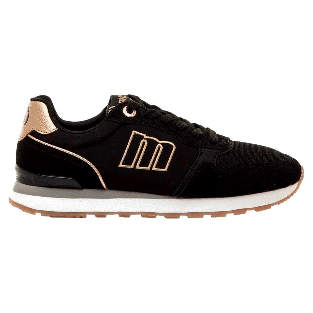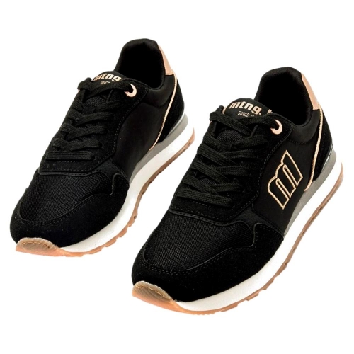 Zapatillas negras para mujer de la marca Mustang, modelo Joggo Classic de estilo deportivo urbano. Este diseño combina paneles en negro con detalles metalizados rosa claro en el talón, ojales y logo lateral, que aportan un contraste sutil y moderno. La suela bicolor con base de goma y las plantillas con tecnología Starfit, mejoran la comodidad en cada paso. Incluyen cierre de cordones y acabado de malla en la puntera. Con certificado VEGANO sellado por INESCOP, el cual garantiza que la naturaleza química principal del material no se corresponde con fibras de origen animal.