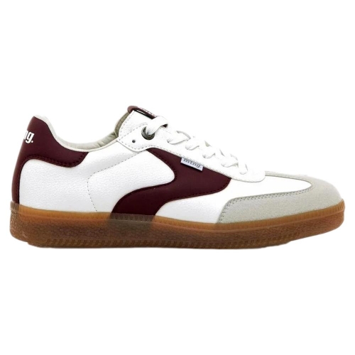 Zapatillas blancas Nova de hombre, marca Mustang. Estas zapatillas bajas tienen un diseño clásico. El contraste entre el blanco y el burdeos en sus detalles laterales y la zona del talón añade un toque elegante, mientras que la suela de goma en color caramelo relaja su estilo y lo convierte en el calzado ideal para el día a día. ¡Conoce Nova de Mustang!