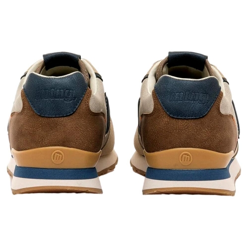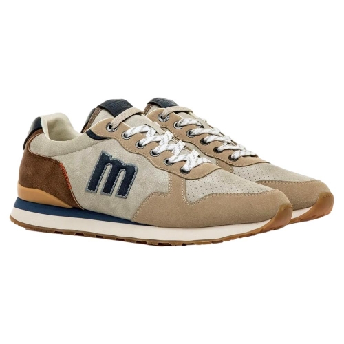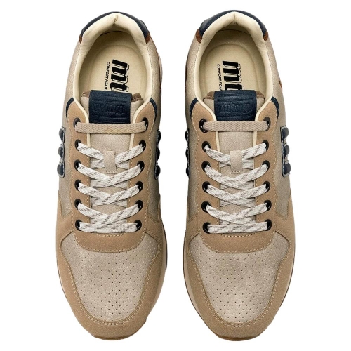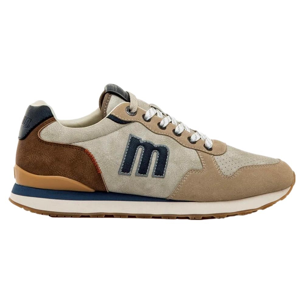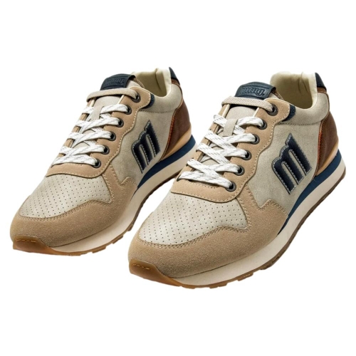 Zapatillas de color beige para hombre, modelo Porland de la marca Mustang, de estilo casual urbano. Este diseño combina paneles en tonos beige, marrón y azul marino, con detalles perforados en la puntera que aportan transpirabilidad. La suela de goma dentada y sus plantillas con tecnología Starfit, mejoran la comodidad en cada paso. Incluyen cordones blancos y el logo lateral en relieve, lo que refuerza su identidad deportiva y versátil. Con certificado VEGANO sellado por INESCOP, el cual garantiza que la naturaleza química principal del material no se corresponde con fibras de origen animal.
