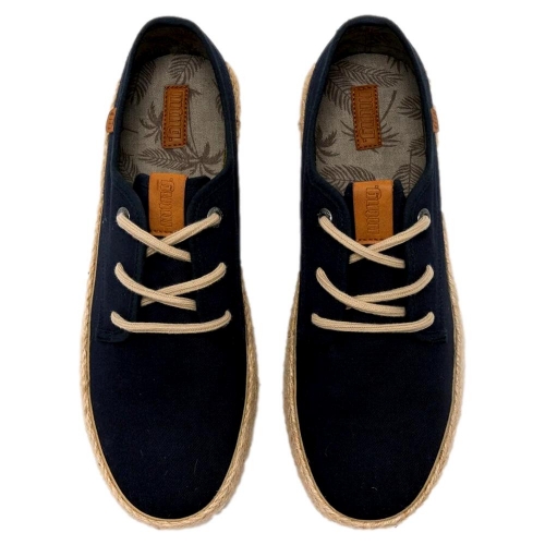 Zapato casual de color azul para hombre de la marca Mustang, modelo Napoli de estilo veraniego. Su diseño combina materiales reciclados con detalles sencillos y una suela de efecto yute trenzado que refuerza su estética natural. Las plantillas estampadas con tecnología Starfit mejoran la comodidad en cada paso, y los cordones a tono completan un calzado fresco, ideal para los días cálidos. Con certificado VEGANO sellado por INESCOP, el cual garantiza que la naturaleza química principal del material no se corresponde con fibras de origen animal.