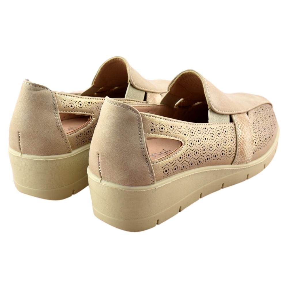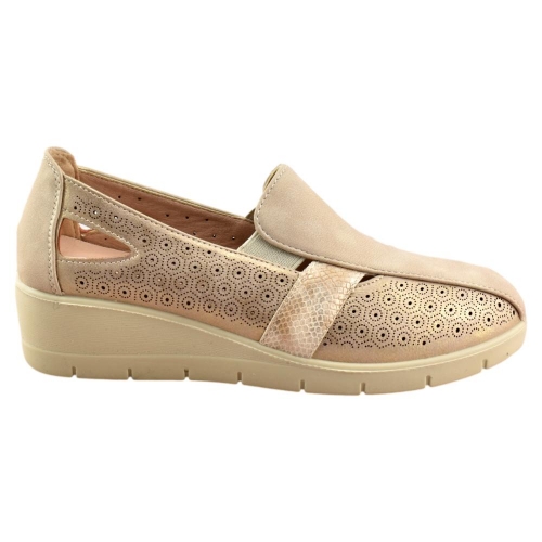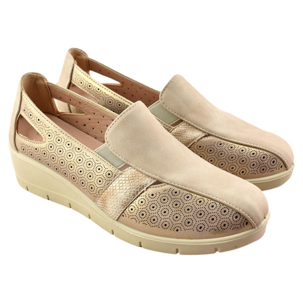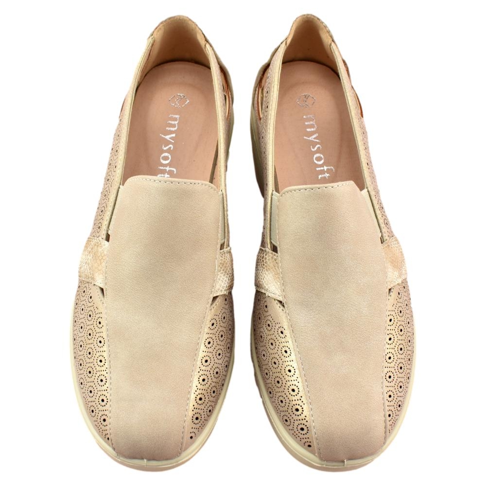 El zapato de cuña para mujer de la marca Mysoft, está fabricado en polipiel con bonito calado en la parte lateral, que dotan a este calzado de una gran transpiración. Tiene una cuña ligera, que no pesa, de unos 5 cm. Los elásticos laterales aseguran un ajuste perfecto, mientras que la plantilla SoftGel extraíble es perfecta para las personas que necesitan poner una plantilla especial.