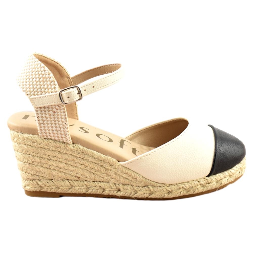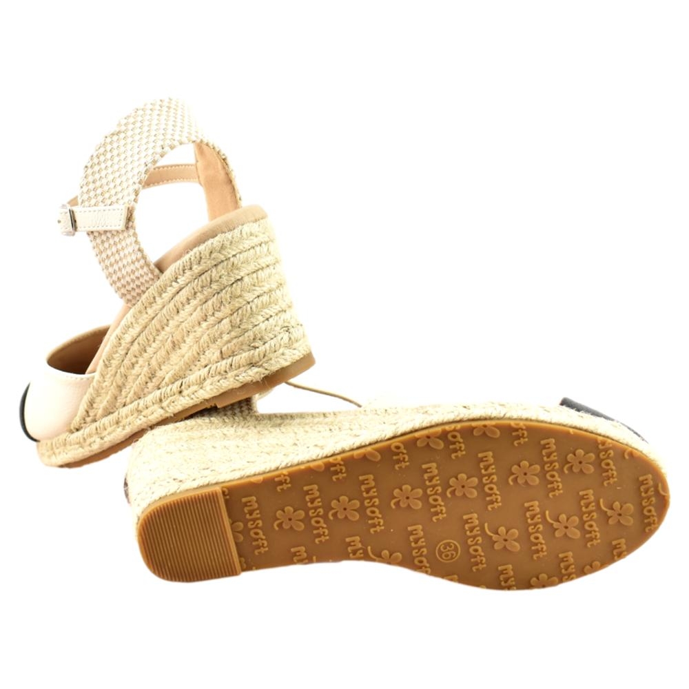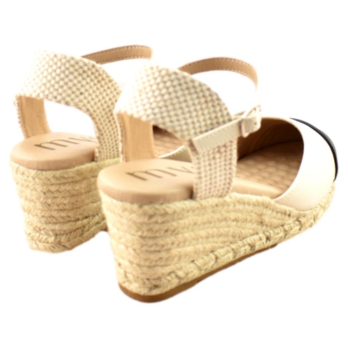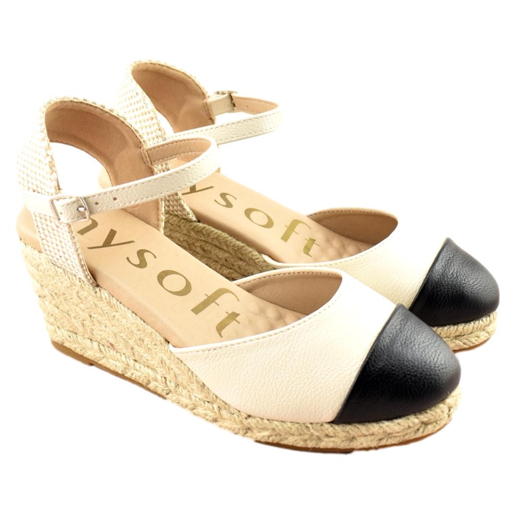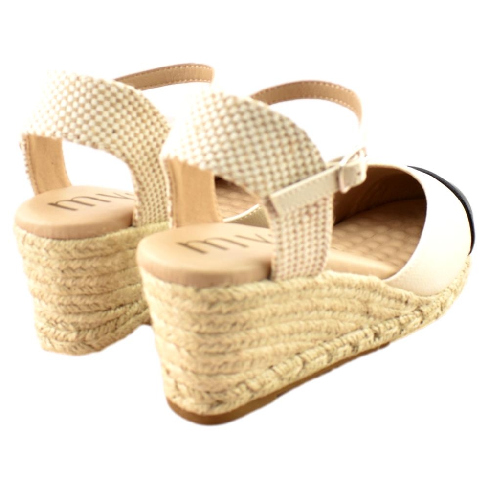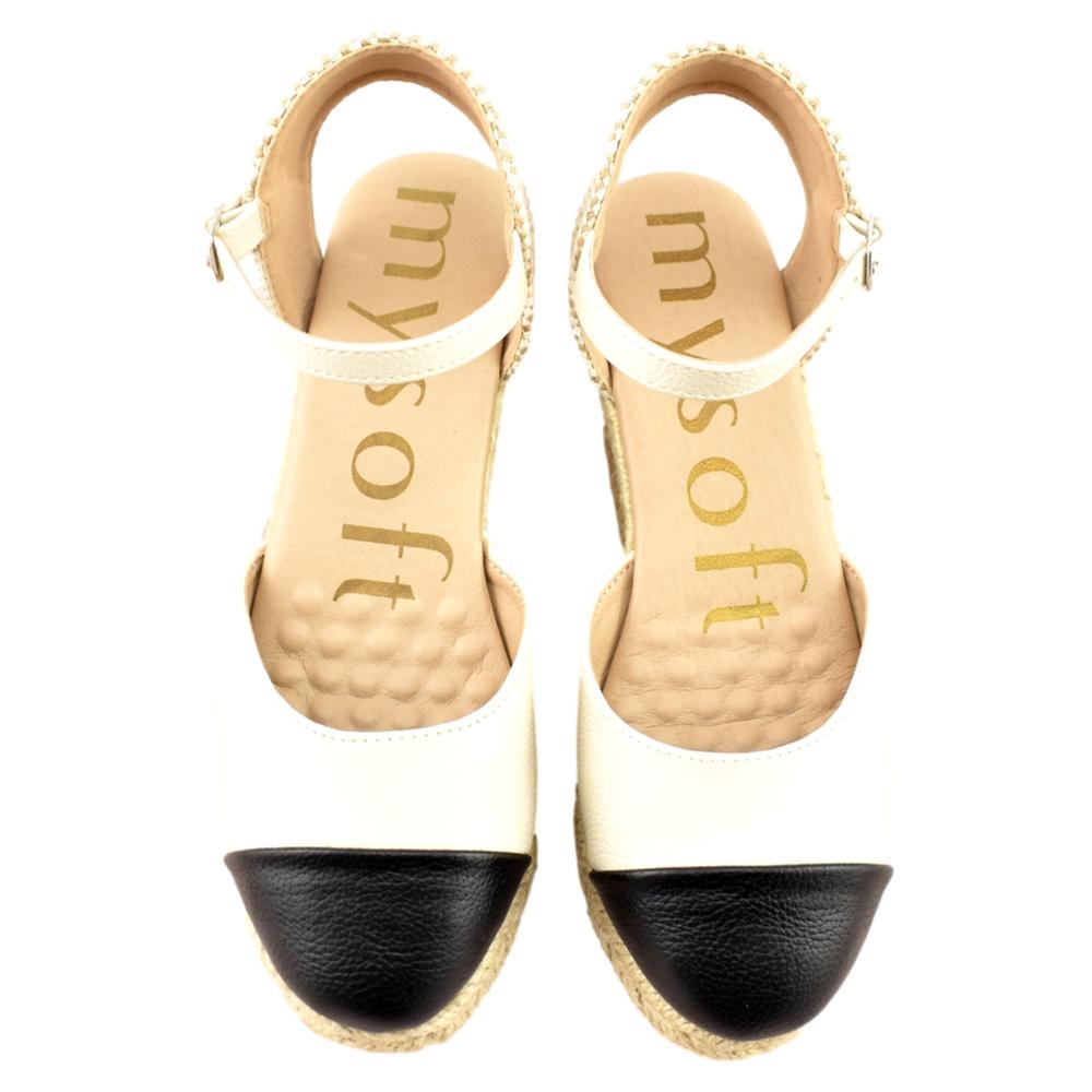 Esparteñas para mujer, bicolor en blanco y oro, cierre de hebilla al tobillo, talón descubierto y puntera cerrada. Plantilla de gel super suave para mayor comodidad. Fabricadas por MySoft.