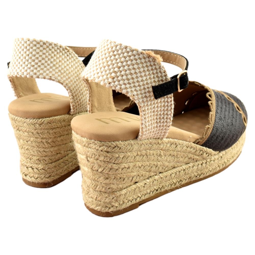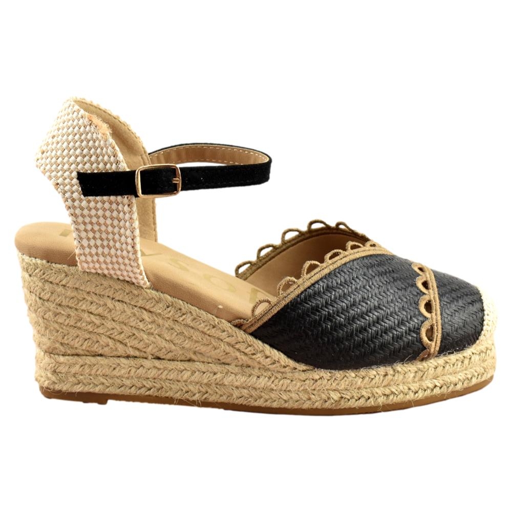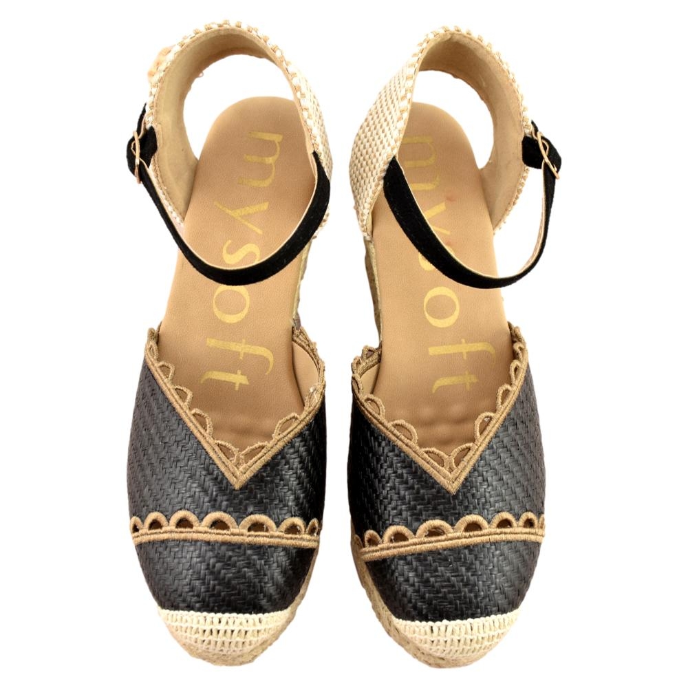 Esparteñas para mujer en color negro y cierre de hebilla al tobillo, talón descubierto y puntera cerrada. Plantilla de gel super suave para mayor comodidad. Fabricadas por MySoft.