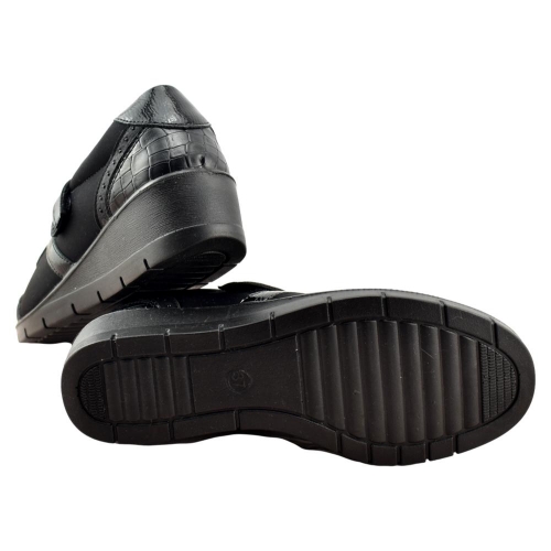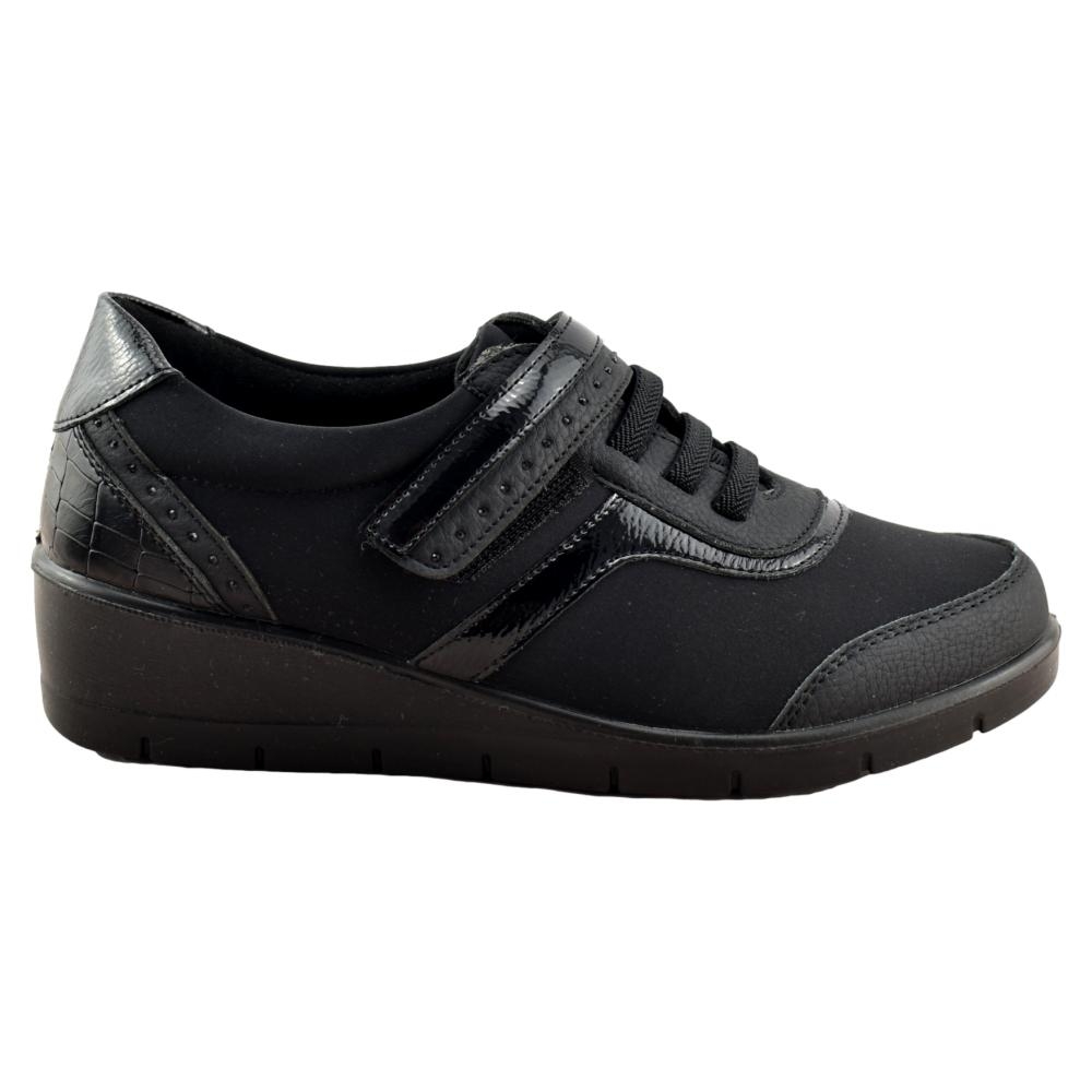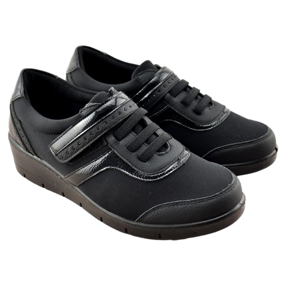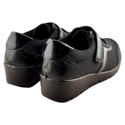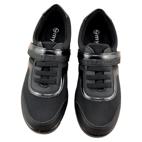 Zapato con cuña de la marca Mysoft para mujer, realizado en material textil con refuerzos en piel sintética. Cierre mediante velcro y cordón elástico para facilitar el calce. Plantilla extraíble de "SoftGel", con nanopartículas de coloide que garantizan la comodidad desde la primera puesta además del memory foam para amortiguar y suavizar los impactos.