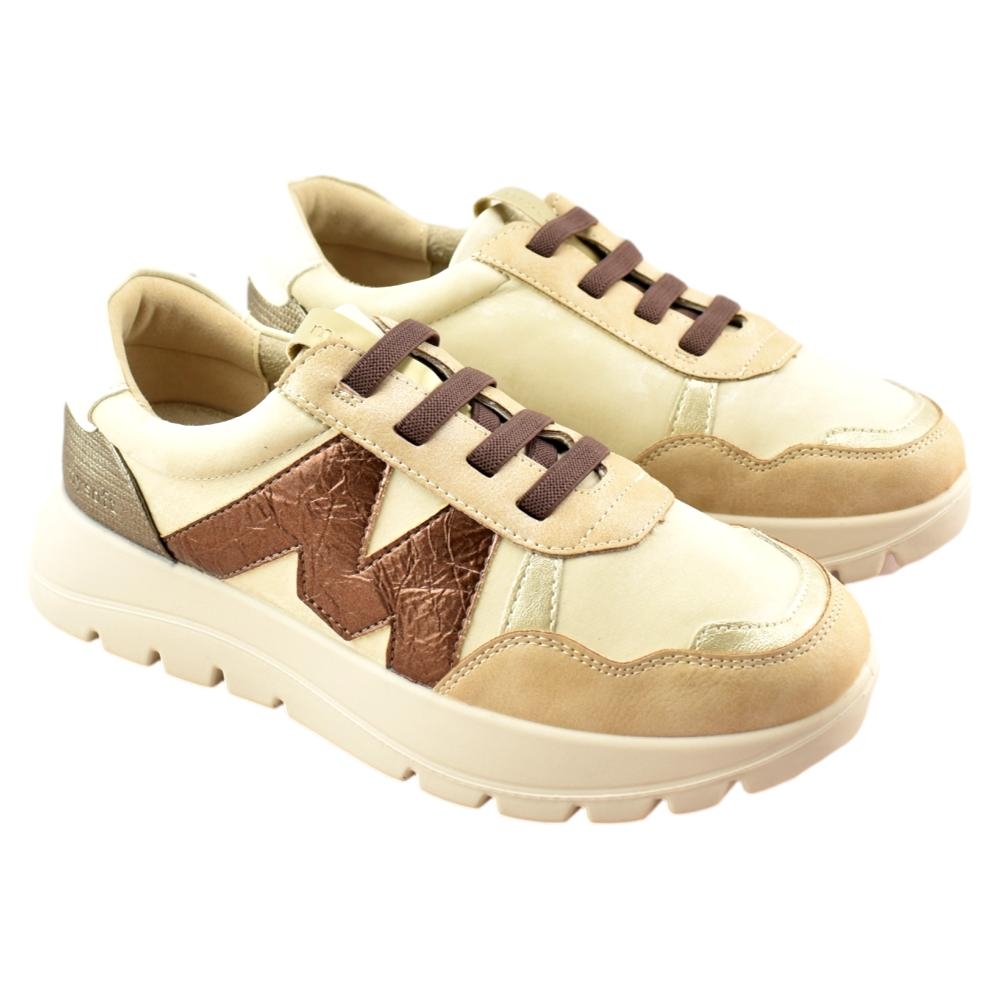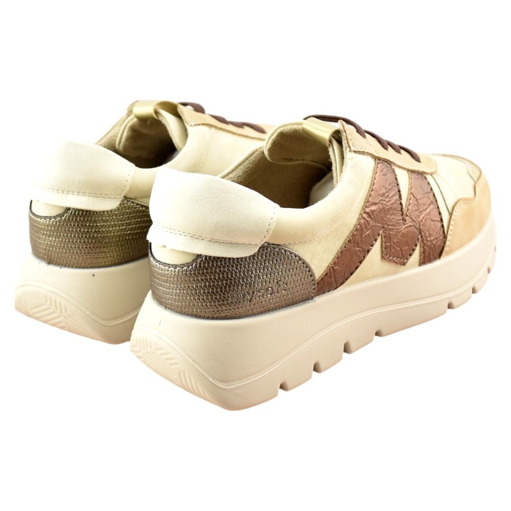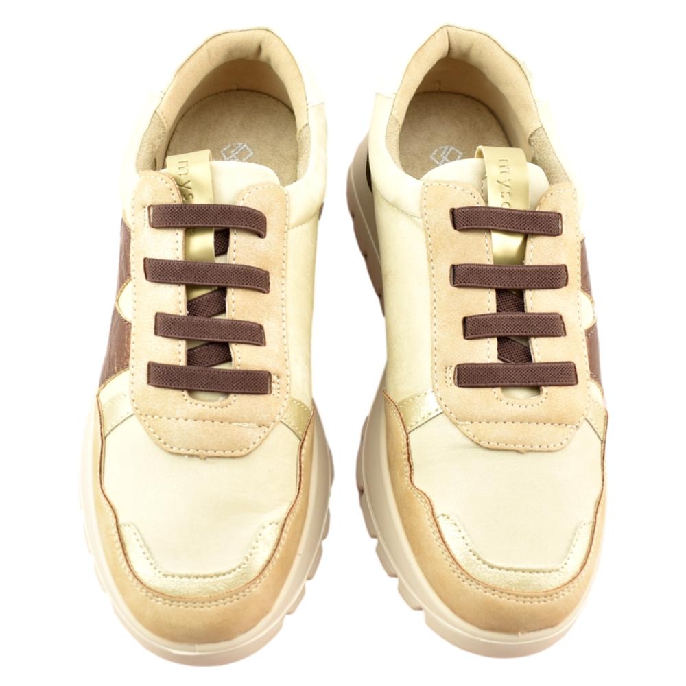 Zapatilla con plataforma de la marca Mysoft para mujer, realizado en material textil con refuerzos en piel sintética. Cierre mediante cordón elástico para facilitar el calce. Plantilla extraíble de "SoftGel", con nanopartículas de coloide que garantizan la comodidad desde la primera puesta además del memory foam para amortiguar y suavizar los impactos.