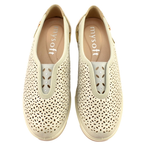 El zapato de cuña para mujer de la marca Mysoft, está fabricado en polipiel con bonito calado en la parte delantera y aberturas laterales, que dotan a este calzado de una gran transpiración. Tiene una cuña ligera, que no pesa, de unos 5 cm. Elástico central que asegura un ajuste perfecto, mientras que la plantilla SoftGel extraíble es perfecta para las personas que necesitan poner una plantilla especial.