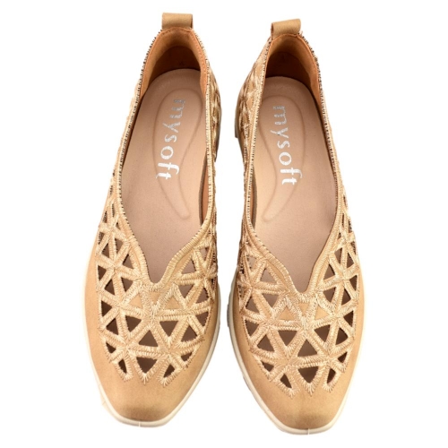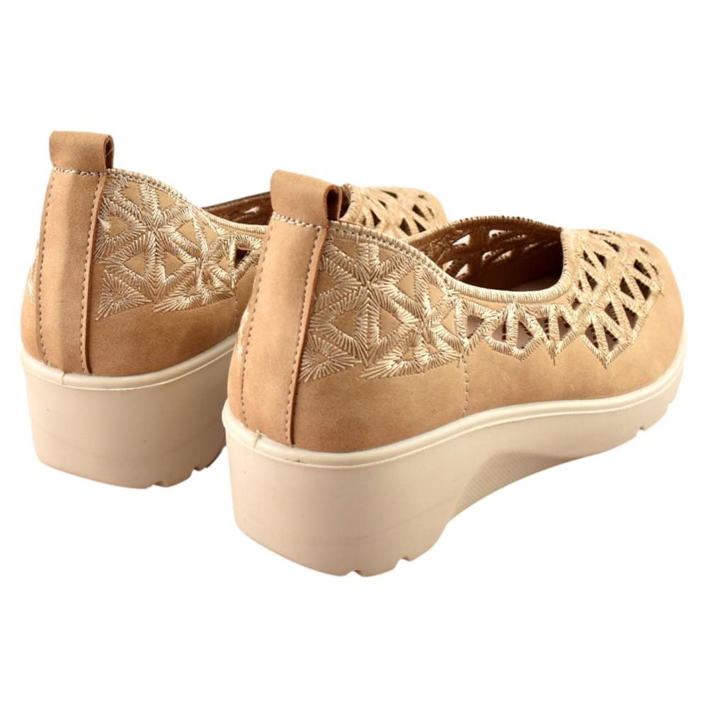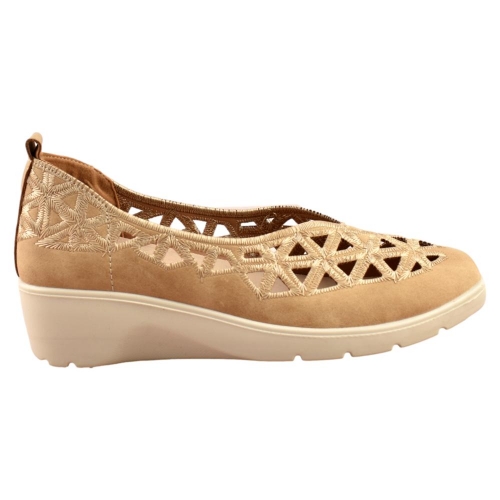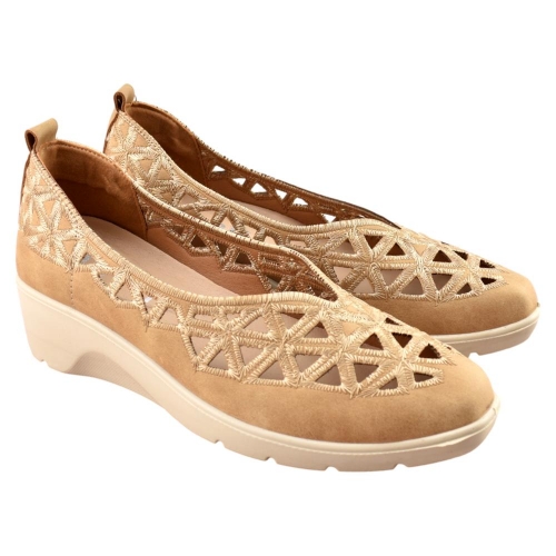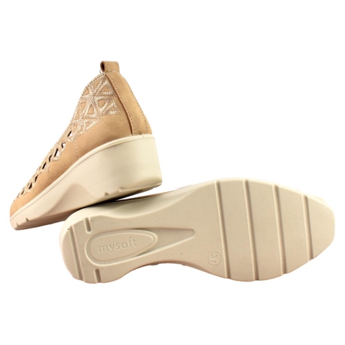 El zapato de cuña para mujer de la marca Mysoft, está fabricado en polipiel con bonito calado que dotan a este calzado de una gran transpiración. Tiene una cuña ligera, que no pesa, de unos 5 cm. mientras que la plantilla SoftGel extraíble es perfecta para las personas que necesitan poner una plantilla especial.