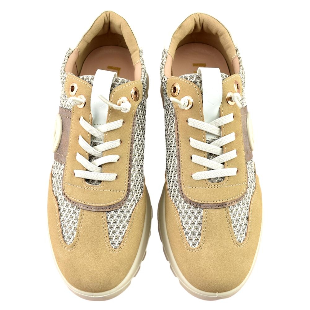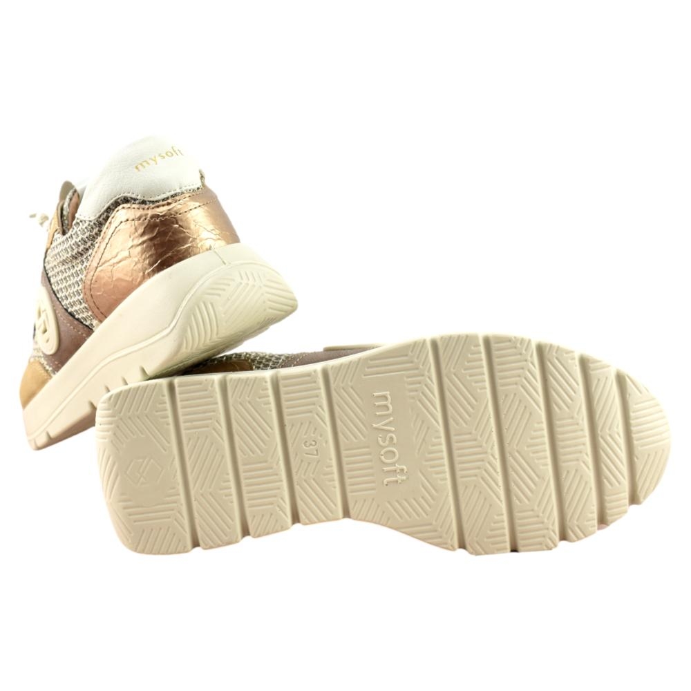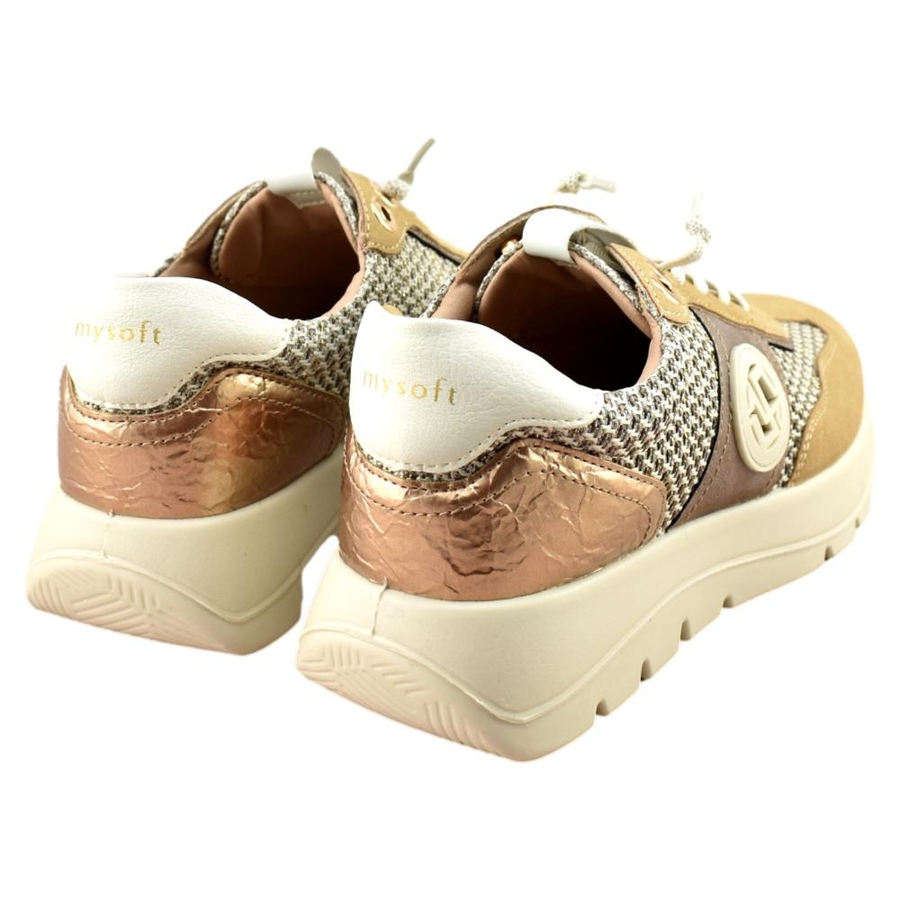 Zapatilla con plataforma de la marca Mysoft para mujer, realizado en material textil con refuerzos en piel sintética. Cierre mediante cordón elástico para facilitar el calce. Plantilla extraíble de "SoftGel", con nanopartículas de coloide que garantizan la comodidad desde la primera puesta además del memory foam para amortiguar y suavizar los impactos.