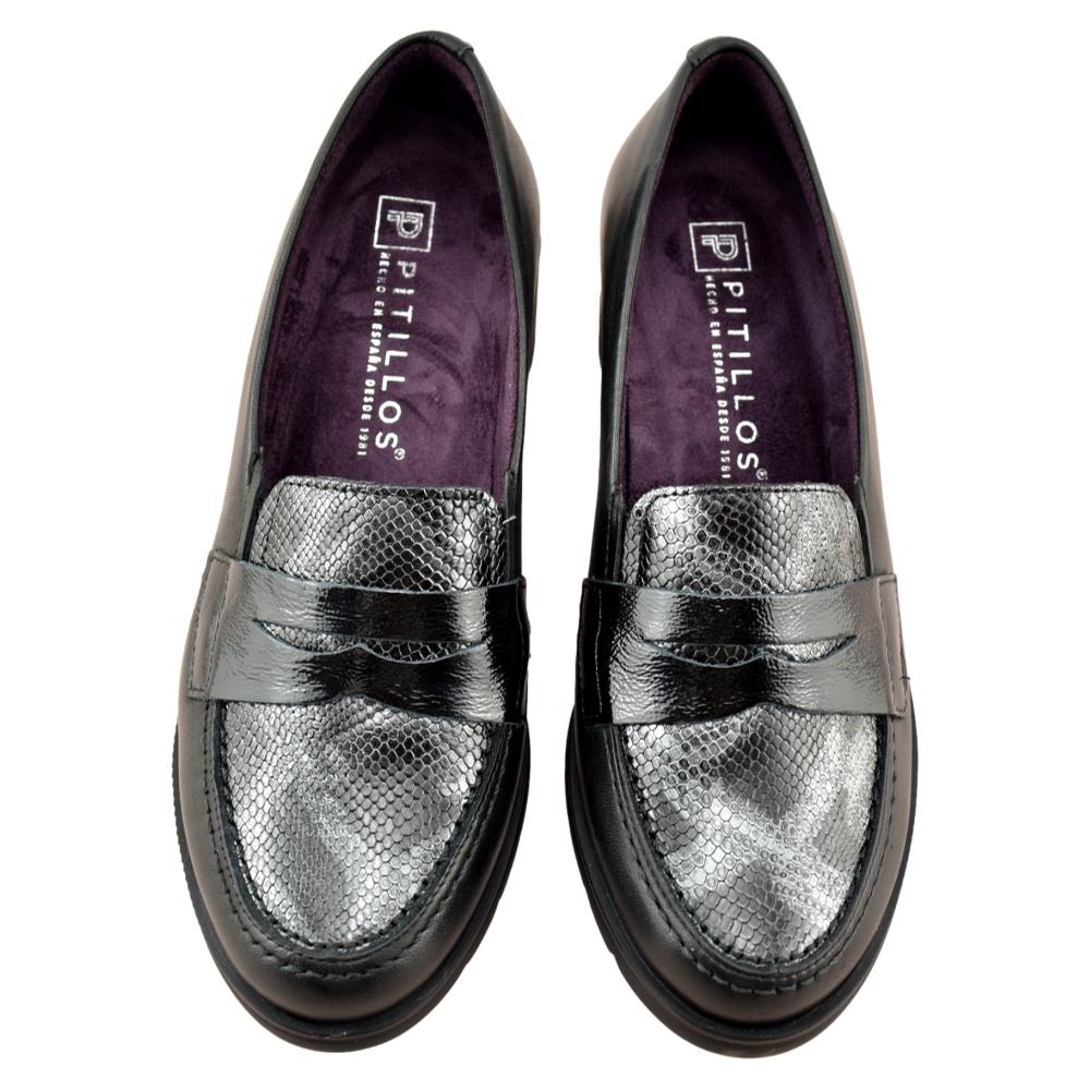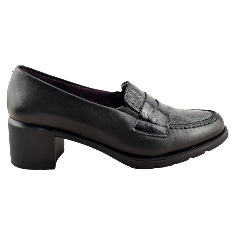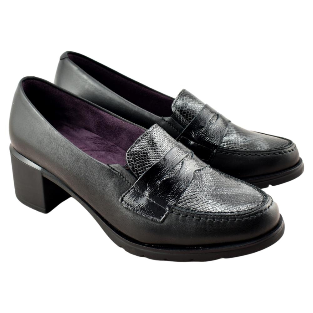 FABRICADO EN ESPAÑA. Mocasín para mujer, realizado en piel combinada lisa con piel grabada print serpiente en el empeine. El forro y la plantilla son térmicos y súper absorbentes, combaten la aparición de olores y proporcionan una agradable sensación de confort y bienestar. Suela de goma antideslizante. Medidas: Tacón 5.5 cm