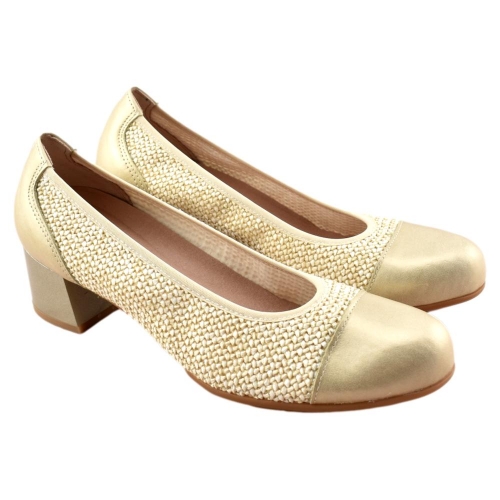 FABRICADO EN ESPAÑA. Zapato de salón con los laterales de rafia muy suave y puntera y talón de piel metalizada. Piso de goma muy flexible. Elegante zapato que podrás lucir con tus mejores looks de este verano .......no pasarás desapercibida!!